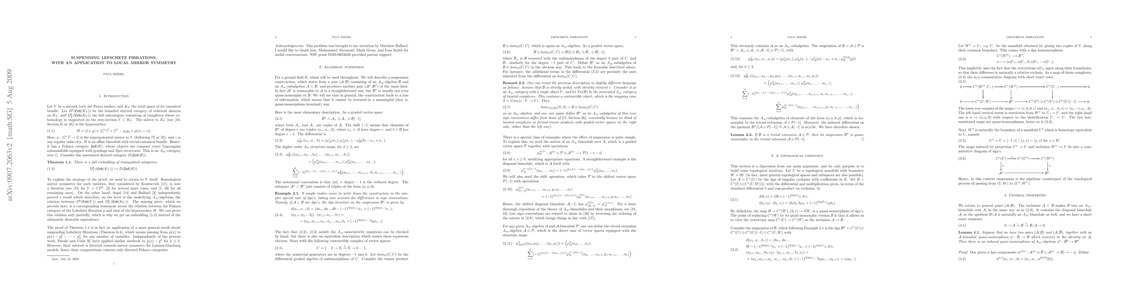 We consider the suspension operation on Lefschetz fibrations, which takes p(x) to p(x)-y^2. This leaves the Fukaya category of the fibration invariant, and changes the category of the fibre (or more precisely, the subcategory consisting of a basis of vanishing cycles) in a specific way. As an application, we prove part of Homological Mirror Symmetry for the total spaces of canonical bundles over toric del Pezzo surfaces.