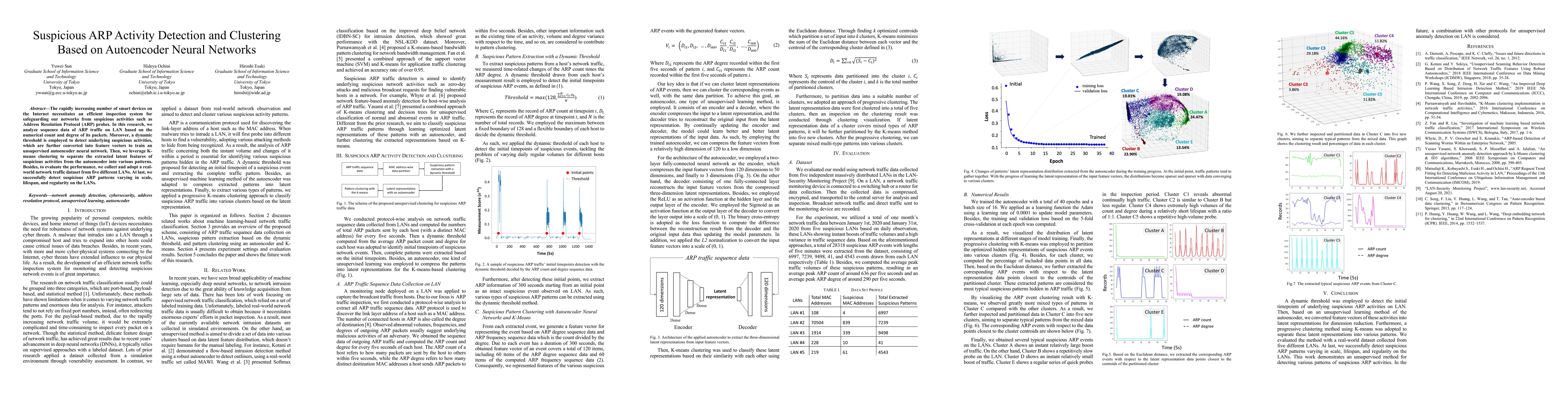 The rapidly increasing number of smart devices on the Internet necessitates an efficient inspection system for safeguarding our networks from suspicious activities such as Address Resolution Protocol (ARP) probes. In this research, we analyze sequence data of ARP traffic on LAN based on the numerical count and degree of its packets. Moreover, a dynamic threshold is employed to detect underlying suspicious activities, which are further converted into feature vectors to train an unsupervised autoencoder neural network. Then, we leverage K-means clustering to separate the extracted latent features of suspicious activities from the autoencoder into various patterns. Besides, to evaluate the performance, we collect and adopt a real-world network traffic dataset from five different LANs. At last, we successfully detect suspicious ARP patterns varying in scale, lifespan, and regularity on the LANs.