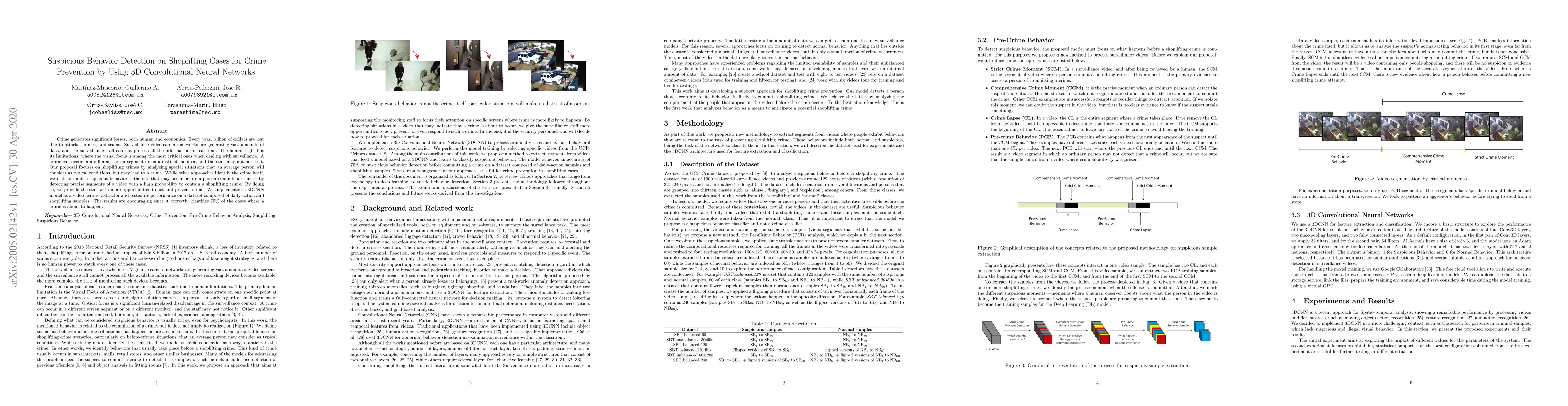 Crime generates significant losses, both human and economic. Every year, billions of dollars are lost due to attacks, crimes, and scams. Surveillance video camera networks are generating vast amounts of data, and the surveillance staff can not process all the information in real-time. The human sight has its limitations, where the visual focus is among the most critical ones when dealing with surveillance. A crime can occur in a different screen segment or on a distinct monitor, and the staff may not notice it. Our proposal focuses on shoplifting crimes by analyzing special situations that an average person will consider as typical conditions, but may lead to a crime. While other approaches identify the crime itself, we instead model suspicious behavior -- the one that may occur before a person commits a crime -- by detecting precise segments of a video with a high probability to contain a shoplifting crime. By doing so, we provide the staff with more opportunities to act and prevent crime. We implemented a 3DCNN model as a video feature extractor and tested its performance on a dataset composed of daily-action and shoplifting samples. The results are encouraging since it correctly identifies 75% of the cases where a crime is about to happen.