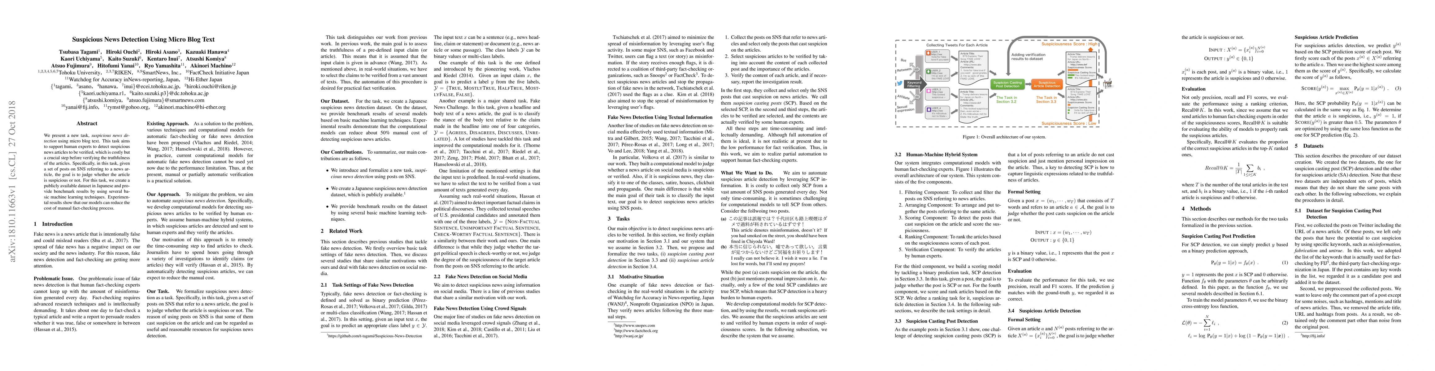 This paper introduces a new task for detecting suspicious news using micro blog text, aiming to assist human experts in verifying news articles. The authors provide a Japanese dataset and benchmark results using machine learning techniques, demonstrating that their models can lower the cost of the manual fact-checking process.