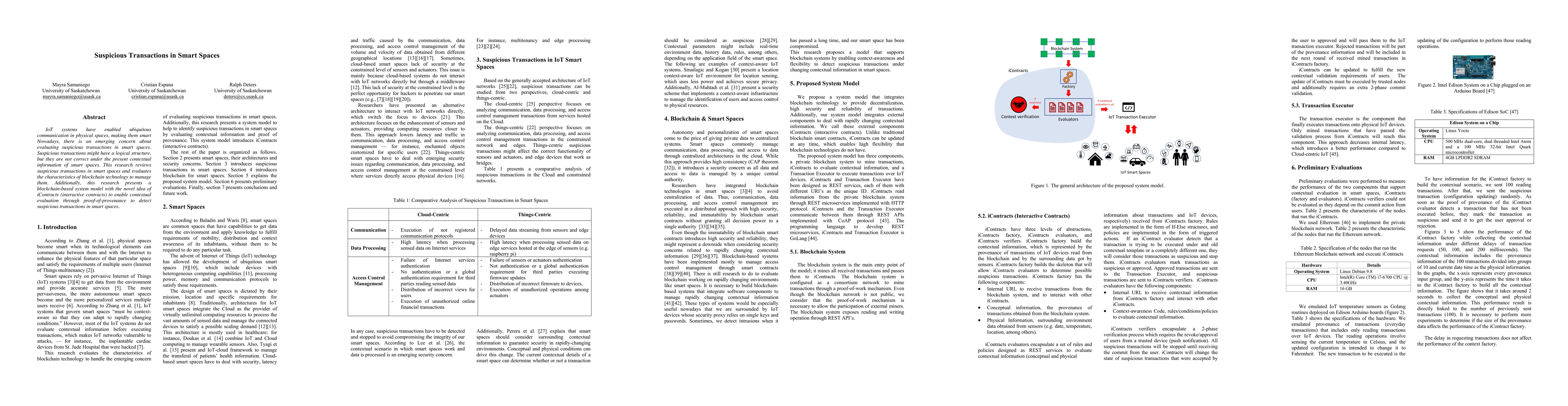 This paper reviews suspicious transactions in smart spaces enabled by IoT systems, highlighting their logical but contextually incorrect nature. It proposes a blockchain-based system model with innovative iContracts to detect such transactions using proof-of-provenance.