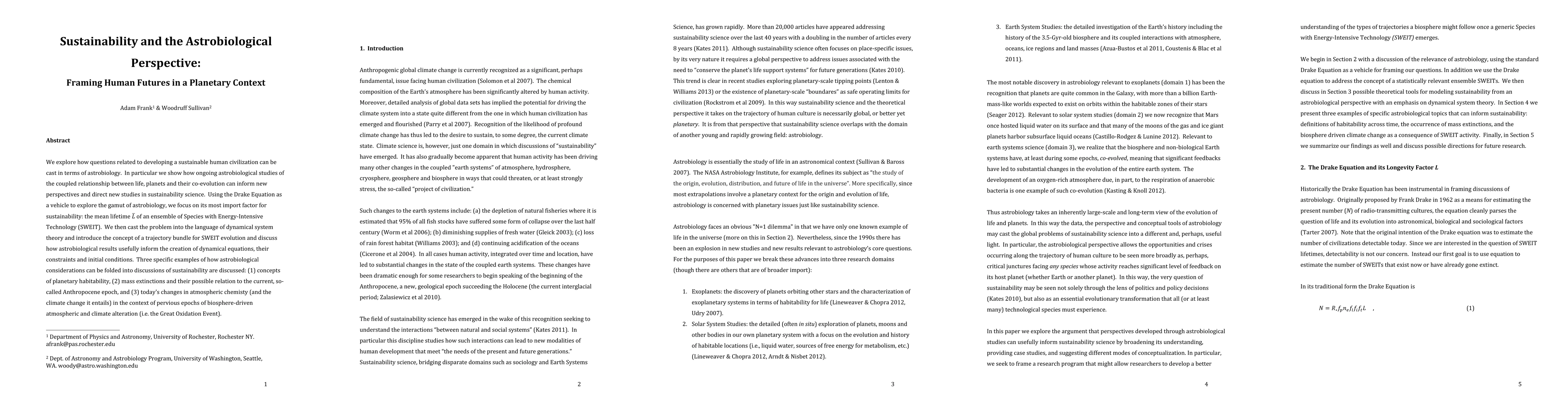 This paper explores how astrobiological perspectives can inform sustainable human futures by analyzing the coupled relationship between life, planets, and their co-evolution. It highlights the importance of considering astrobiological factors in sustainability science, particularly the mean lifetime of energy-intensive species.