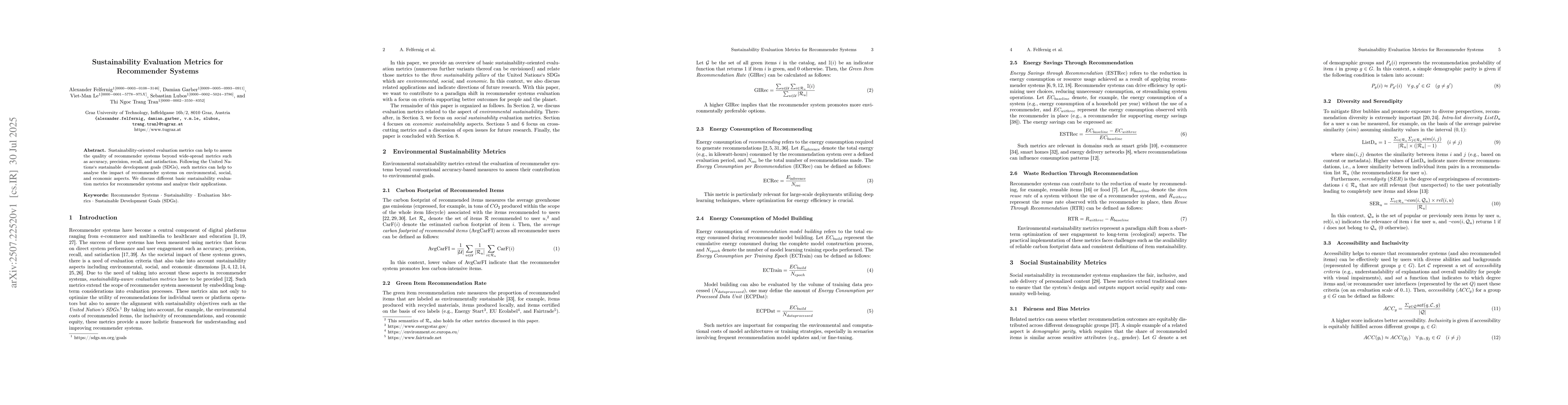 The paper discusses sustainability-oriented evaluation metrics for recommender systems, aligning with the United Nations' Sustainable Development Goals (SDGs). It explores various basic sustainability evaluation metrics, including Energy Savings Through Recommendation (ESTRec), Waste Reduction Through Recommendation (RTR), Social Sustainability Metrics (Fairness, Diversity, Accessibility, Inclusivity, Harmful Item Exposure), Economic Sustainability Metrics (Support for Local Businesses, Long-term Customer Satisfaction, Fairness in Exposure), and Cross-cutting Sustainability Metrics (Sustainable User Behavior, Interpretability of Recommendations, Life Cycle Impact of Recommendations).