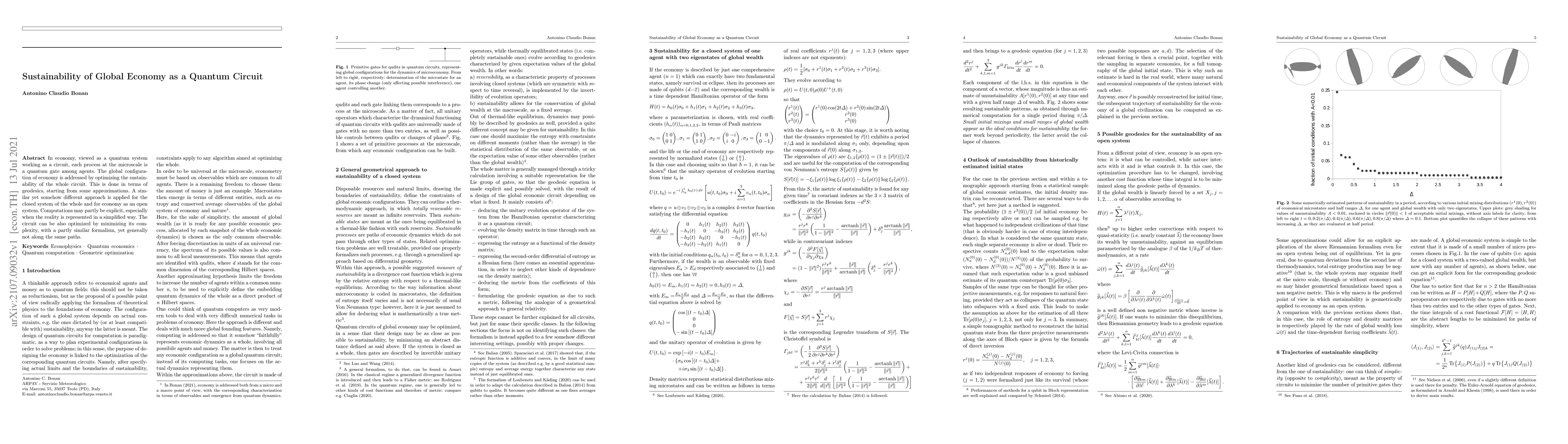 The paper introduces a quantum circuit model for the global economy, formulating geodesic equations for sustainability and simplicity, and providing a framework for optimizing economic processes using quantum information geometry.