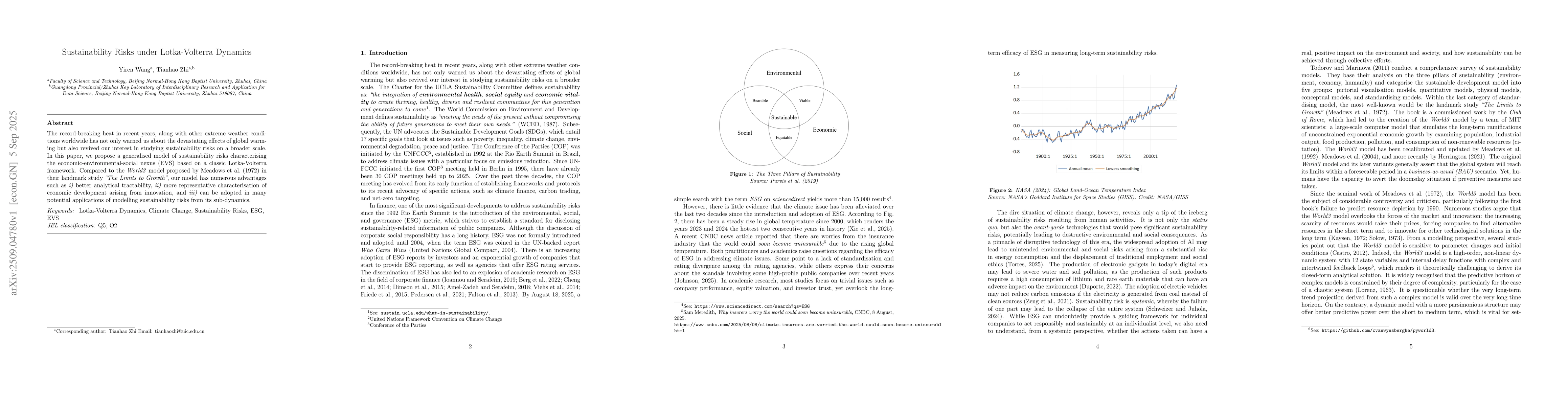 The record-breaking heat in recent years, along with other extreme weather conditions worldwide has not only warned us about the devastating effects of global warming but also revived our interest in studying sustainability risks on a broader scale. In this paper, we propose a generalised model of sustainability risks characterising the economic-environmental-social nexus (EVS) based on a classic Lotka-Volterra framework. Compared to the World3 model proposed by Meadows et al. (1972) in their landmark study "The Limits to Growth", our model has numerous advantages such as i) better analytical tractability, ii) more representative characterisation of economic development arising from innovation, and iii) can be adopted in many potential applications of modelling sustainability risks from its sub-dynamics.