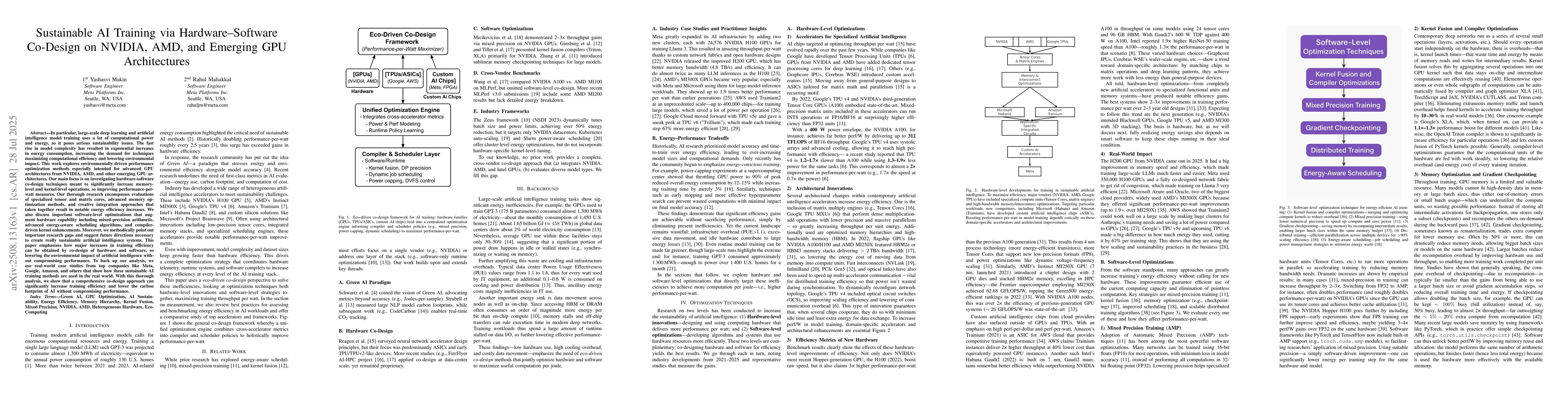 In particular, large-scale deep learning and artificial intelligence model training uses a lot of computational power and energy, so it poses serious sustainability issues. The fast rise in model complexity has resulted in exponential increases in energy consumption, increasing the demand for techniques maximizing computational efficiency and lowering environmental impact. This work explores environmentally driven performance optimization methods especially intended for advanced GPU architectures from NVIDIA, AMD, and other emerging GPU architectures. Our main focus is on investigating hardware-software co-design techniques meant to significantly increase memory-level and kernel-level operations, so improving performance-per-watt measures. Our thorough research encompasses evaluations of specialized tensor and matrix cores, advanced memory optimization methods, and creative integration approaches that taken together result in notable energy efficiency increases. We also discuss important software-level optimizations that augment hardware capability including mixed-precision arithmetic, advanced energy-aware scheduling algorithms, and compiler-driven kernel enhancements. Moreover, we methodically point out important research gaps and suggest future directions necessary to create really sustainable artificial intelligence systems. This paper emphasizes how major increases in training efficiency can be obtained by co-design of hardware and software, so lowering the environmental impact of artificial intelligence without compromising performance. To back up our analysis, we use real-world case studies from top companies like Meta, Google, Amazon, and others that show how these sustainable AI training methods are used in the real world.