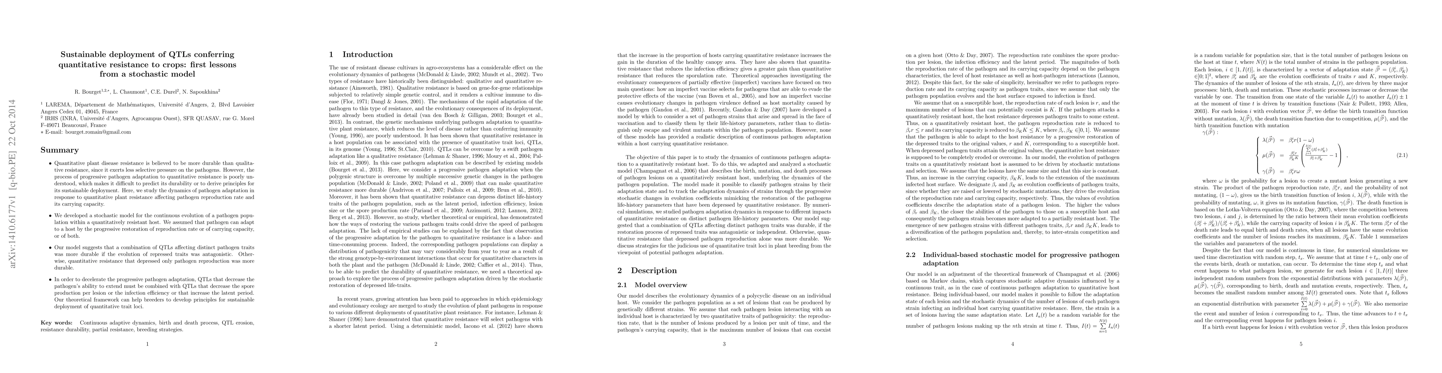 This theoretical framework can help breeders develop principles for sustainable deployment of quantitative trait loci (QTLs) to combat plant diseases by predicting the durability of quantitative resistance and decelerating pathogen adaptation.