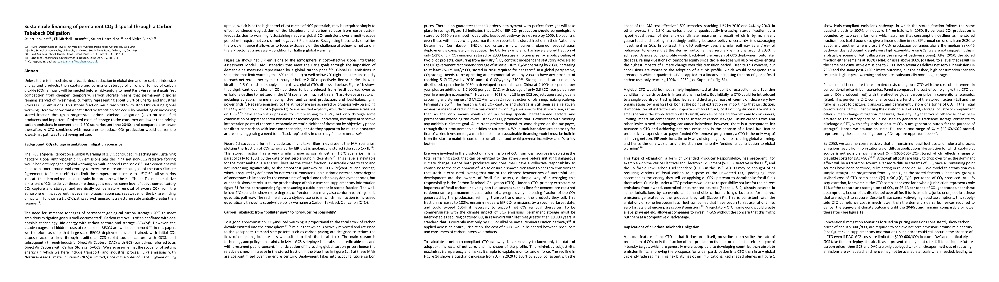 This paper proposes a Carbon Takeback Obligation (CTO) to mandate fossil fuel producers and importers to fund permanent CO2 storage, ensuring a transition to sustainable financing for CO2 disposal. The CTO is projected to be cost-effective, offering lower storage costs to consumers compared to conventional carbon pricing, and is suggested as a low-risk pathway to achieving net zero emissions.