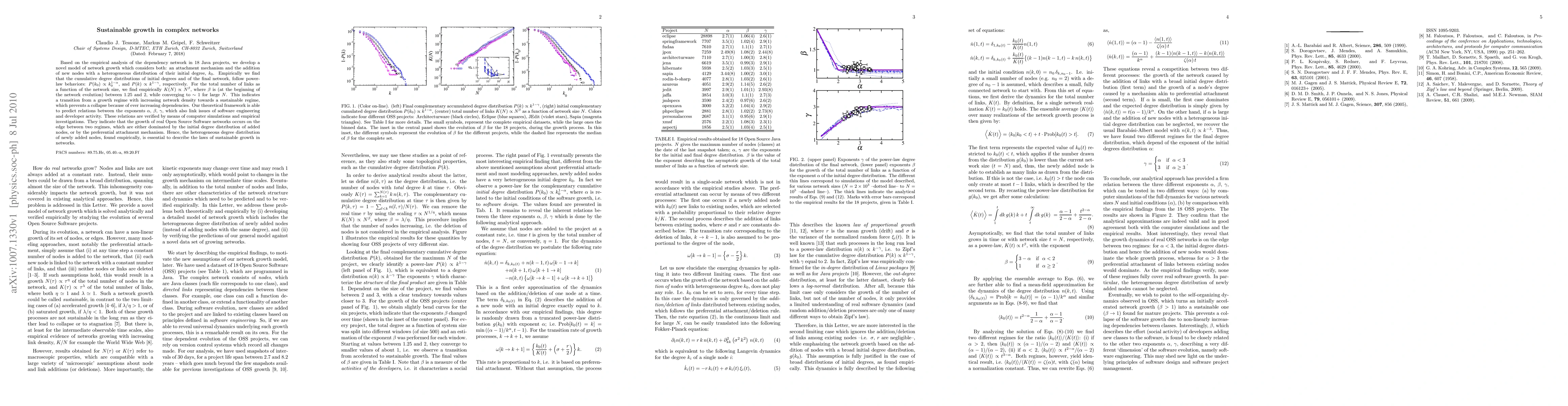 Based on the empirical analysis of the dependency network in 18 Java projects, we develop a novel model of network growth which considers both: an attachment mechanism and the addition of new nodes with a heterogeneous distribution of their initial degree, $k_0$. Empirically we find that the cumulative degree distributions of initial degrees and of the final network, follow power-law behaviors: $P(k_{0}) \propto k_{0}^{1-\alpha}$, and $P(k)\propto k^{1-\gamma}$, respectively. For the total number of links as a function of the network size, we find empirically $K(N)\propto N^{\beta}$, where $\beta$ is (at the beginning of the network evolution) between 1.25 and 2, while converging to $\sim 1$ for large $N$. This indicates a transition from a growth regime with increasing network density towards a sustainable regime, which revents a collapse because of ever increasing dependencies. Our theoretical framework is able to predict relations between the exponents $\alpha$, $\beta$, $\gamma$, which also link issues of software engineering and developer activity. These relations are verified by means of computer simulations and empirical investigations. They indicate that the growth of real Open Source Software networks occurs on the edge between two regimes, which are either dominated by the initial degree distribution of added nodes, or by the preferential attachment mechanism. Hence, the heterogeneous degree distribution of newly added nodes, found empirically, is essential to describe the laws of sustainable growth in networks.
