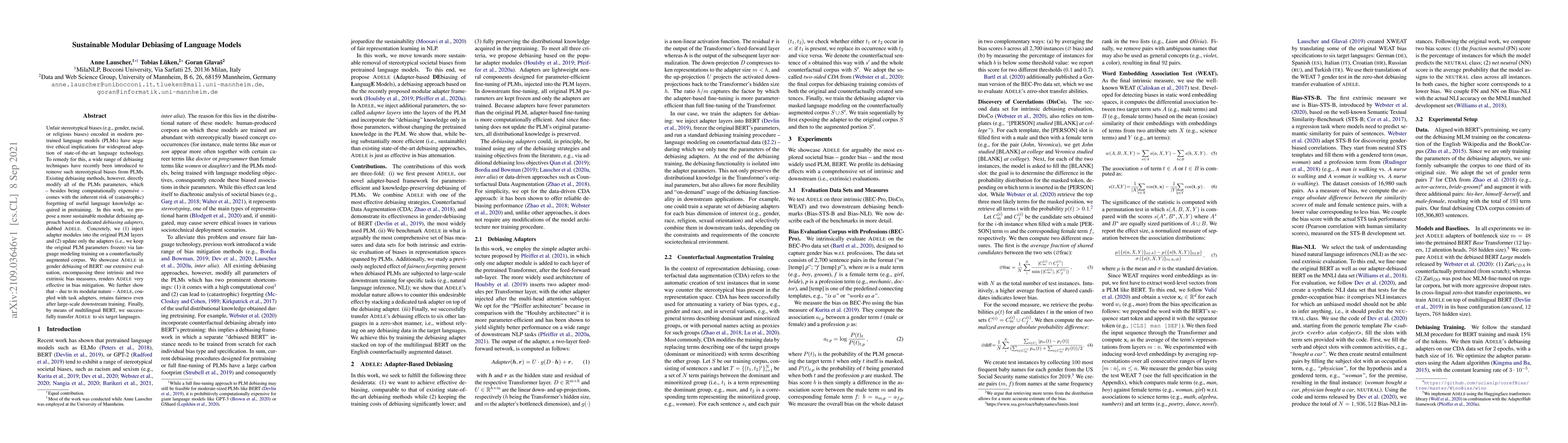 This paper proposes ADELE, a modular debiasing method for language models that uses dedicated adapters to mitigate biases without altering the original model parameters, thus avoiding catastrophic forgetting. ADELE effectively reduces gender biases in BERT and retains fairness after downstream training, demonstrating successful transfer to multiple languages.