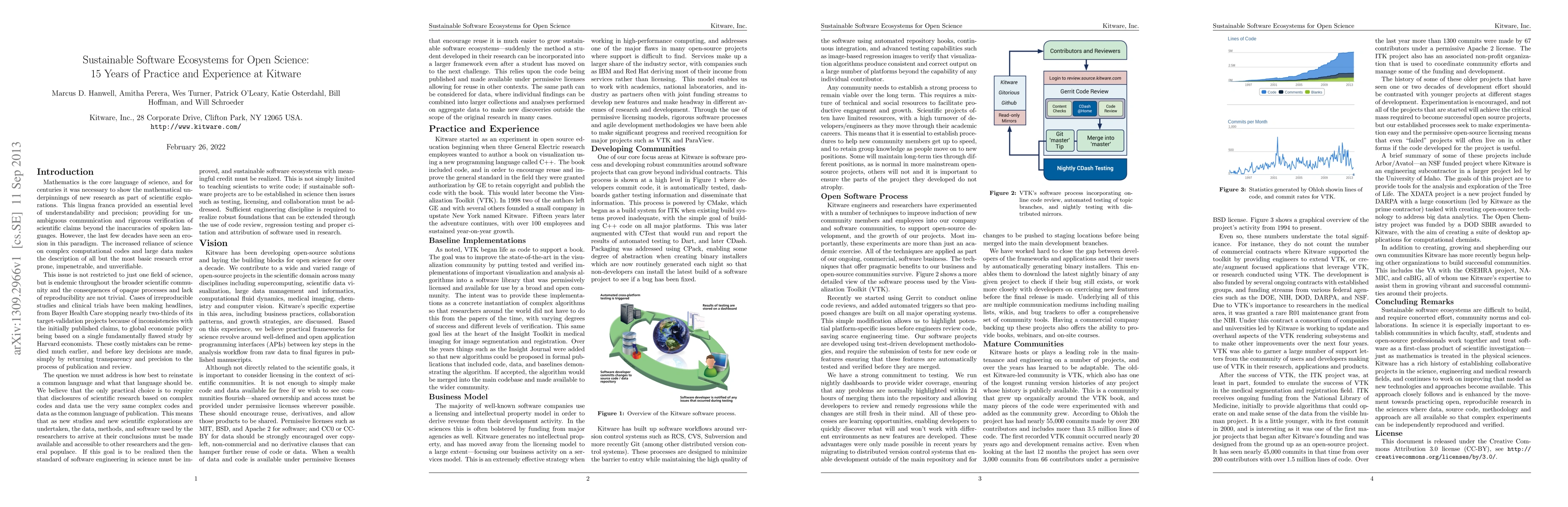 This paper discusses the development of sustainable software ecosystems in open science, emphasizing collaborative efforts and community norms to treat software as a scientific product. Kitware’s initiatives in science and medical research exemplify the importance of open, reproducible research practices.