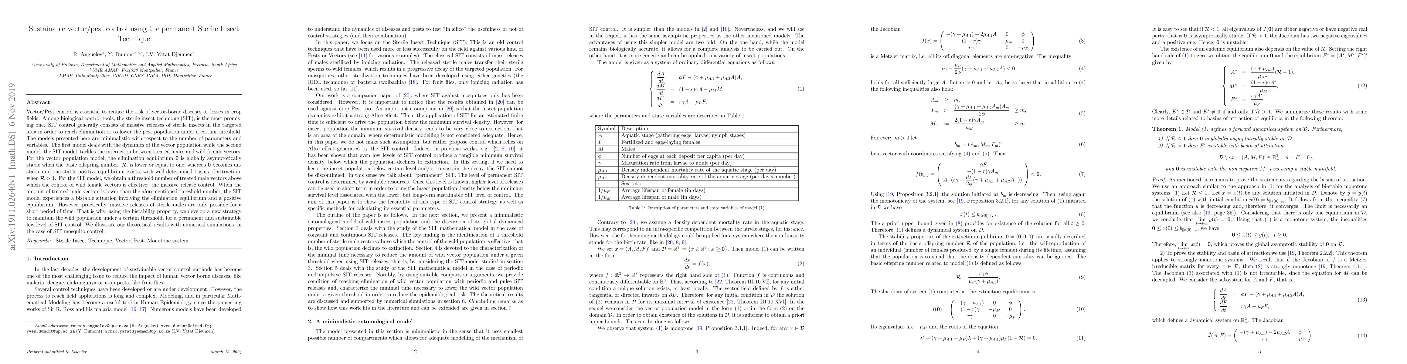 This paper proposes a sustainable vector/pest control strategy using the Sterile Insect Technique (SIT), demonstrating that the vector population can be maintained at a low level through a new control strategy leveraging the technique's bistability property. The SIT model shows that massive releases of sterile males can effectively control wild female vectors, but a permanent strategy is developed to sustain low pest populations without continuous massive releases.