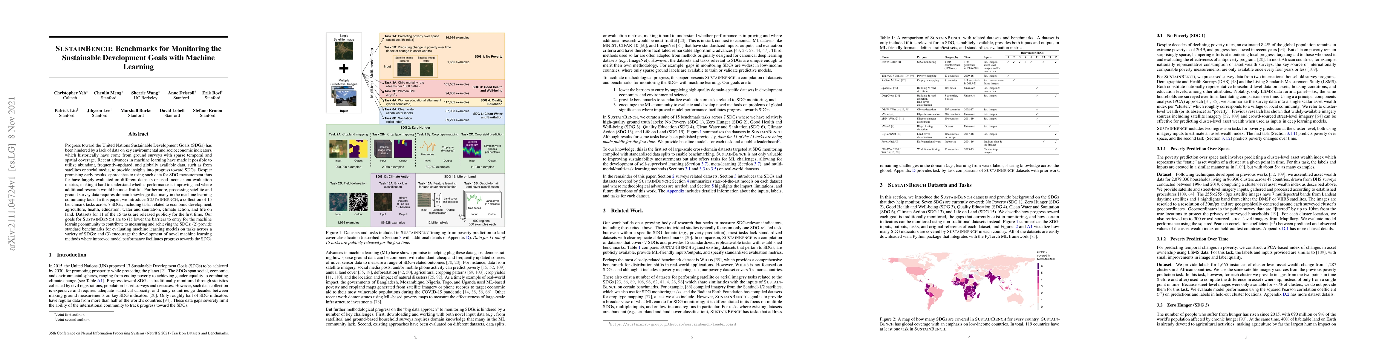 SustainBench introduces a collection of 15 benchmark tasks for evaluating machine learning models in measuring the United Nations Sustainable Development Goals, aiming to lower entry barriers and provide consistent evaluation metrics. The initiative also releases datasets to encourage novel method development for SDG progress.