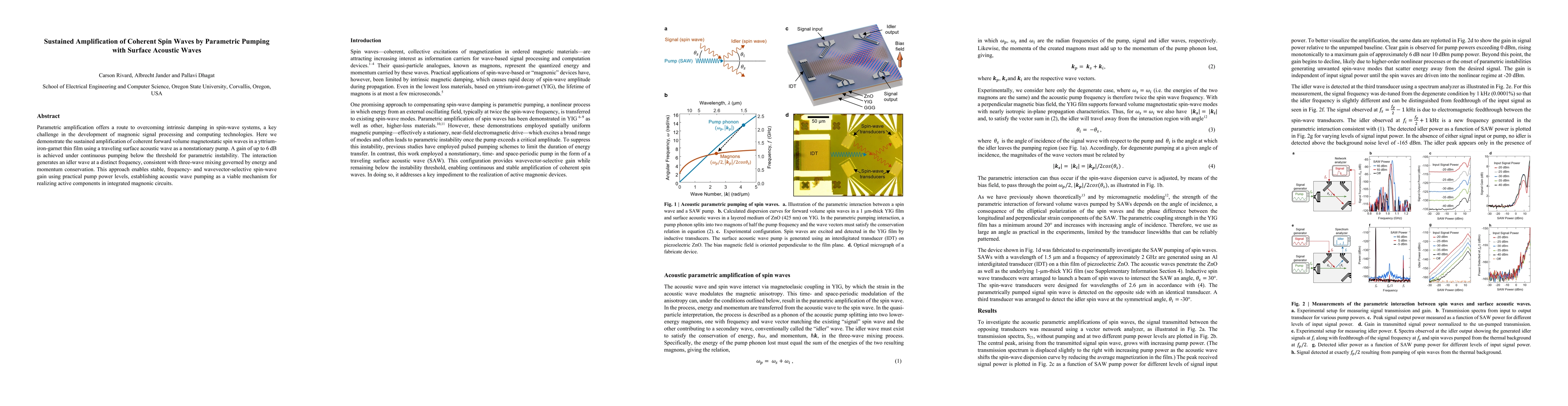 The paper introduces a method for sustained amplification of coherent spin waves using surface acoustic waves, demonstrating three-wave mixing and idler generation for potential use in magnonic devices.