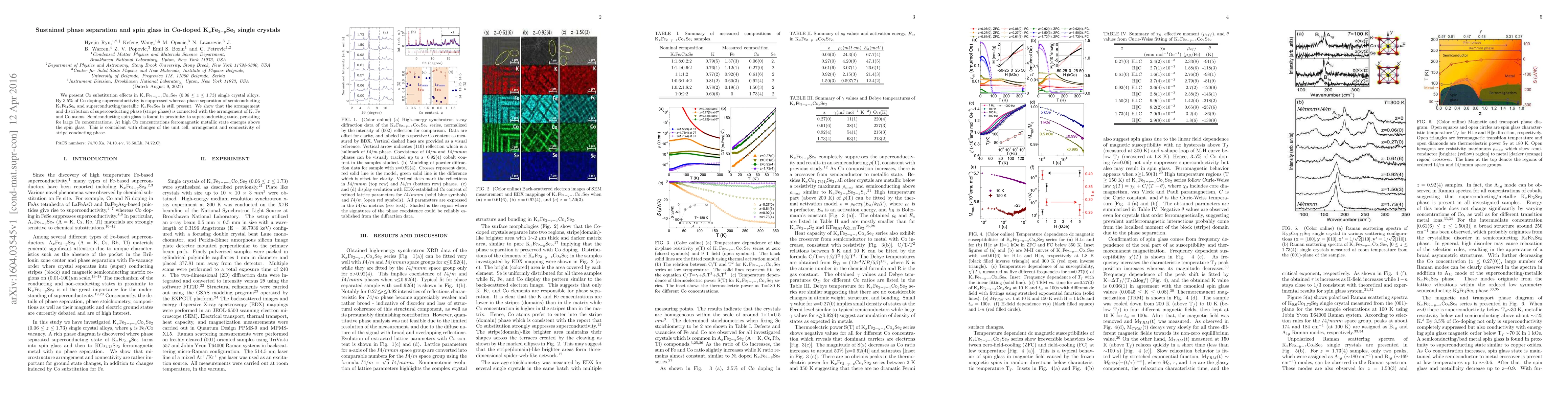 We present Co substitution effects in K$_{x}$Fe$_{2-y-z}$Co$_{z}$Se$_{2}$ (0.06 $\leq$ $z$ $\leq$ 1.73) single crystal alloys. By 3.5\% of Co doping superconductivity is suppressed whereas phase separation of semiconducting K$_{2}$Fe$_{4}$Se$_{5}$ and superconducting/metallic K$_{x}$Fe$_{2}$Se$_{2}$ is still present. We show that the arrangement and distribution of superconducting phase (stripe phase) is connected with the arrangement of K, Fe and Co atoms. Semiconducting spin glass is found in proximity to superconducting state, persisting for large Co concentrations. At high Co concentrations ferromagnetic metallic state emerges above the spin glass. This is coincident with changes of the unit cell, arrangement and connectivity of stripe conducting phase.