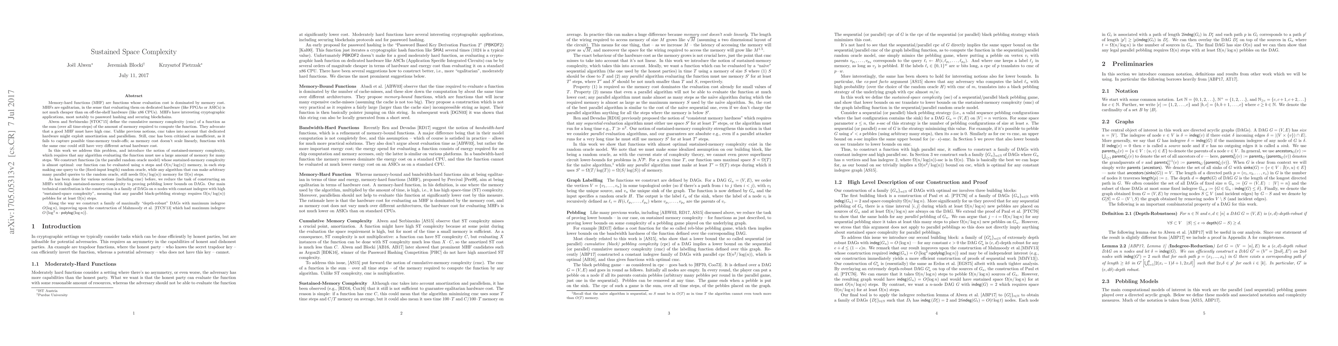 This paper introduces 'sustained-memory complexity', addressing the limitation of previous memory-hard function (MHF) evaluation measures. It presents a construction of functions with nearly optimal sustained-memory complexity, requiring significant memory usage over many computation steps. The methodology involves creating a family of directed acyclic graphs (DAGs) ensuring high 'sustained-space complexity', which forces any parallel algorithm to maintain substantial memory usage throughout the computation.