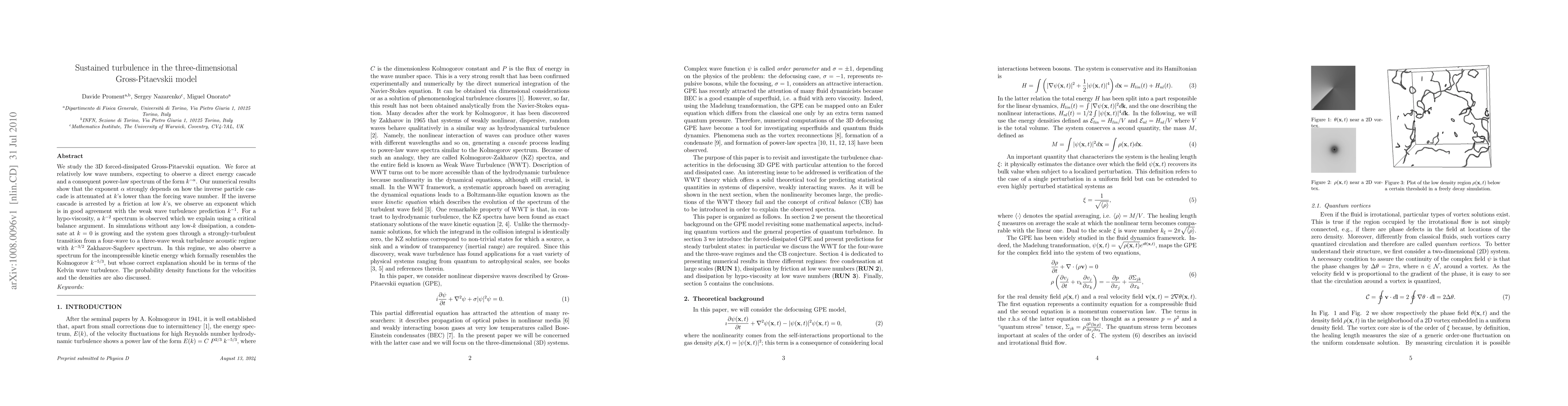 Research on the 3D Gross-Pitaevskii equation reveals that turbulence behavior depends on low-k dissipation, with exponents of -1 or -2 observed for certain conditions, and a strongly-turbulent transition to a $k^{-3/2}$ spectrum in simulations without dissipation.