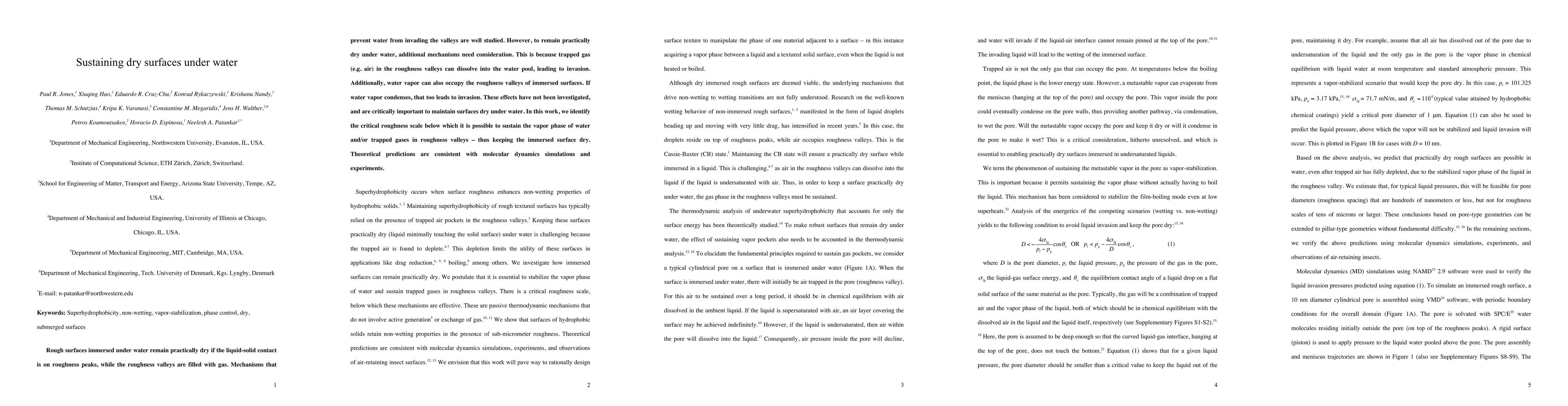 Rough surfaces immersed under water remain practically dry if the liquid-solid contact is on roughness peaks, while the roughness valleys are filled with gas. Mechanisms that prevent water from invading the valleys are well studied. However, to remain practically dry under water, additional mechanisms need consideration. This is because trapped gas (e.g. air) in the roughness valleys can dissolve into the water pool, leading to invasion. Additionally, water vapor can also occupy the roughness valleys of immersed surfaces. If water vapor condenses, that too leads to invasion. These effects have not been investigated, and are critically important to maintain surfaces dry under water. In this work, we identify the critical roughness scale below which it is possible to sustain the vapor phase of water and/or trapped gases in roughness valleys - thus keeping the immersed surface dry. Theoretical predictions are consistent with molecular dynamics simulations and experiments.