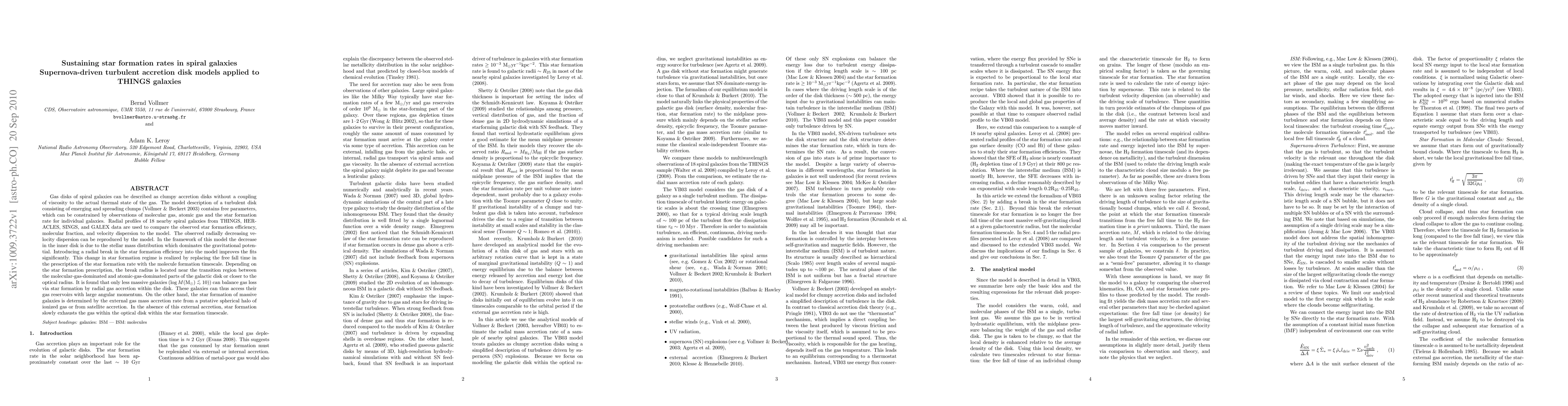 This paper models the gas disks of spiral galaxies as turbulent accretion disks with emerging clumps, using observational data from THINGS galaxies to constrain the model. The study finds that less massive galaxies can sustain star formation through radial gas accretion, while more massive galaxies rely on external gas accretion.