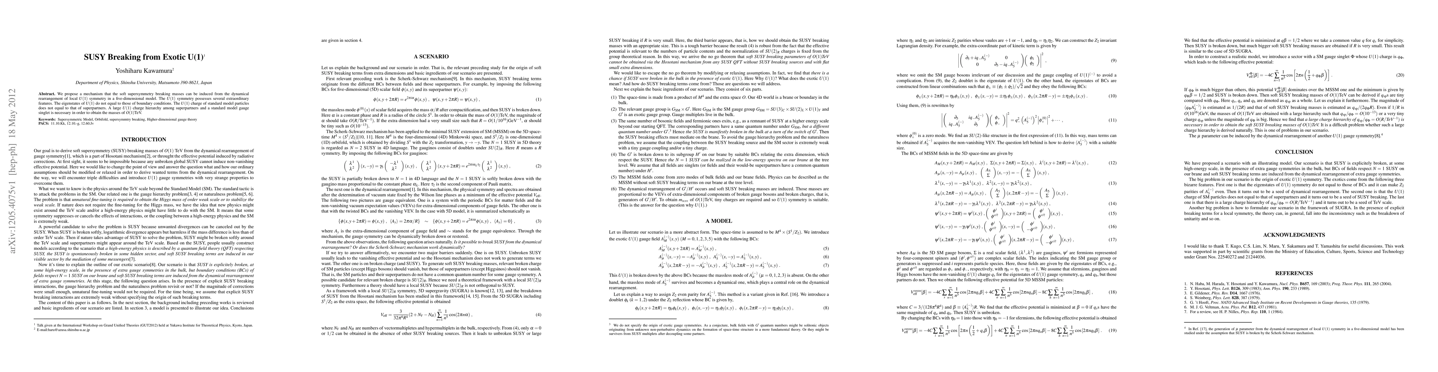 We propose a mechanism that the soft supersymmetry breaking masses can be induced from the dynamical rearrangement of local U(1) symmetry in a five-dimensional model. The U(1) symmetry possesses several extraordinary features. The eigenstates of U(1) do not equal to those of boundary conditions. The U(1) charge of standard model particles does not equal to that of superpartners. A large U(1) charge hierarchy among superpartners and a standard model gauge singlet is necessary in order to obtain the masses of O(1)TeV.