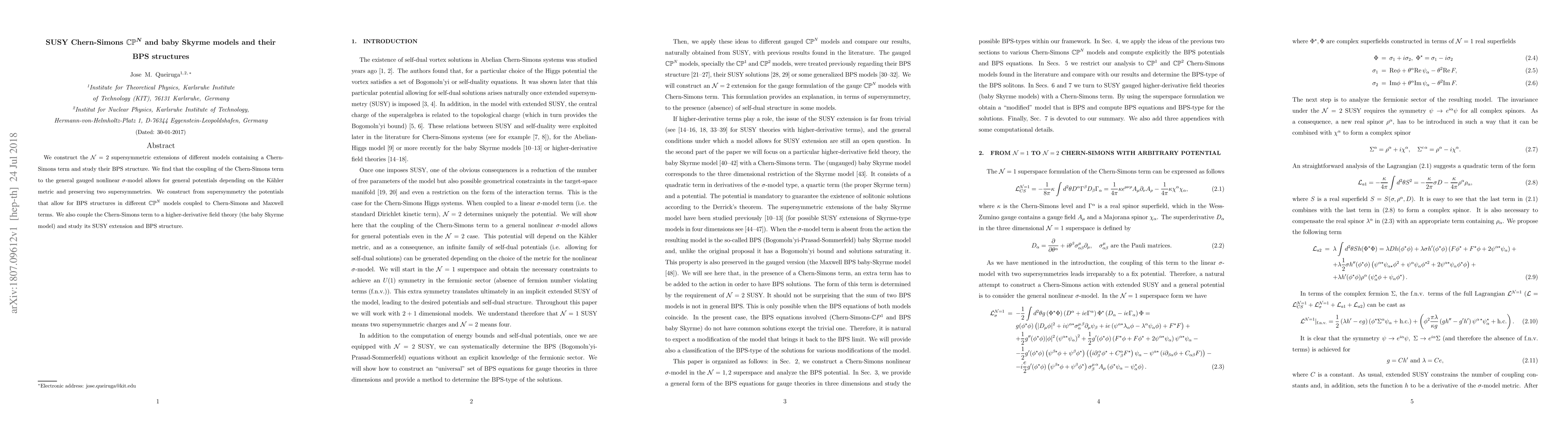 We construct the $\mathcal{N}=2$ supersymmetric extensions of different models containing a Chern-Simons term and study their BPS structure. We find that the coupling of the Chern-Simons term to the general gauged nonlinear $\sigma$-model allows for general potentials depending on the K\"{a}hler metric and preserving two supersymmetries. We construct from supersymmetry the potentials that allow for BPS structures in different $\mathbb{C}P^{N}$ models coupled to Chern-Simons and Maxwell terms. We also couple the Chern-Simons term to a higher-derivative field theory (the baby Skyrme model) and study its SUSY extension and BPS structure.