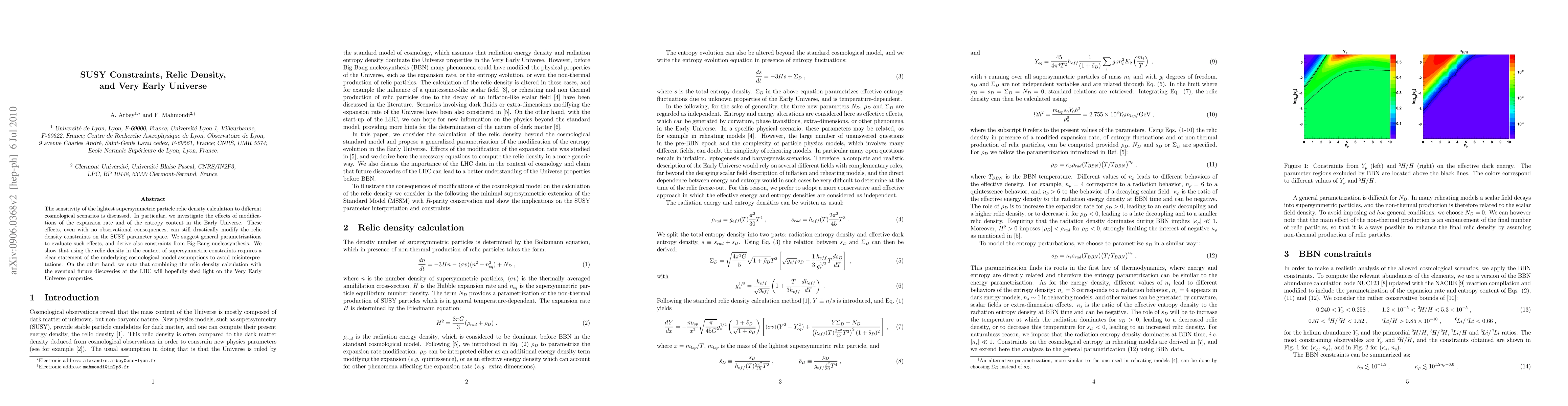 This paper examines how variations in the early universe's expansion rate and entropy content affect the relic density of the lightest supersymmetric particle, thereby altering SUSY constraints. It proposes general parametrizations to assess these effects and highlights the necessity of clear cosmological model assumptions when using relic density in supersymmetric analyses.