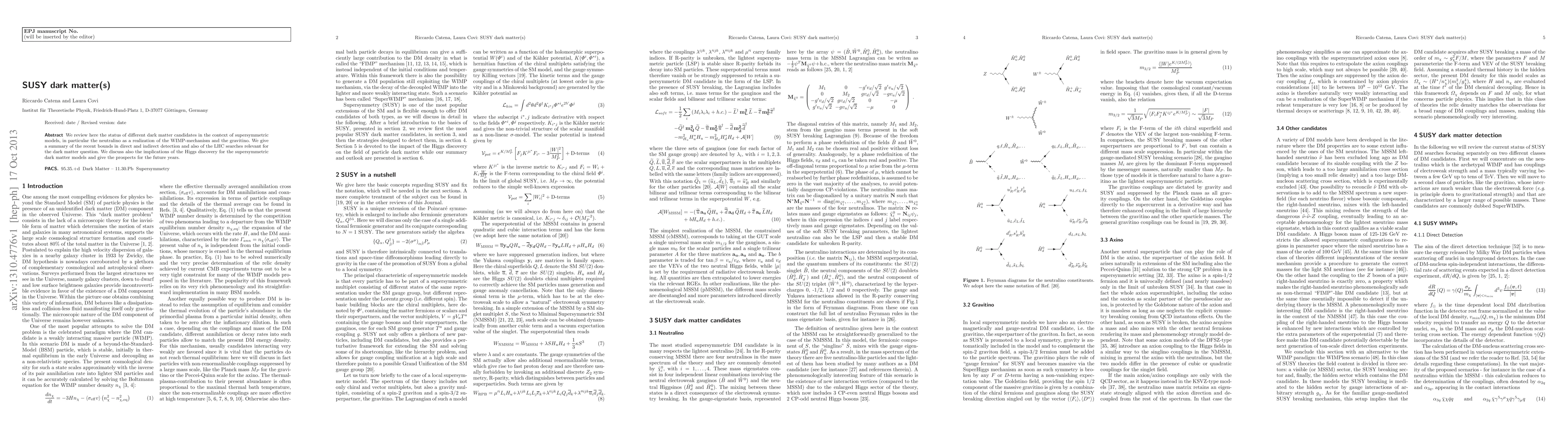 We review here the status of different dark matter candidates in the context of supersymmetric models, in particular the neutralino as a realization of the WIMP-mechanism and the gravitino. We give a summary of the recent bounds in direct and indirect detection and also of the LHC searches relevant for the dark matter question. We discuss also the implications of the Higgs discovery for the supersymmetric dark matter models and give the prospects for the future years.