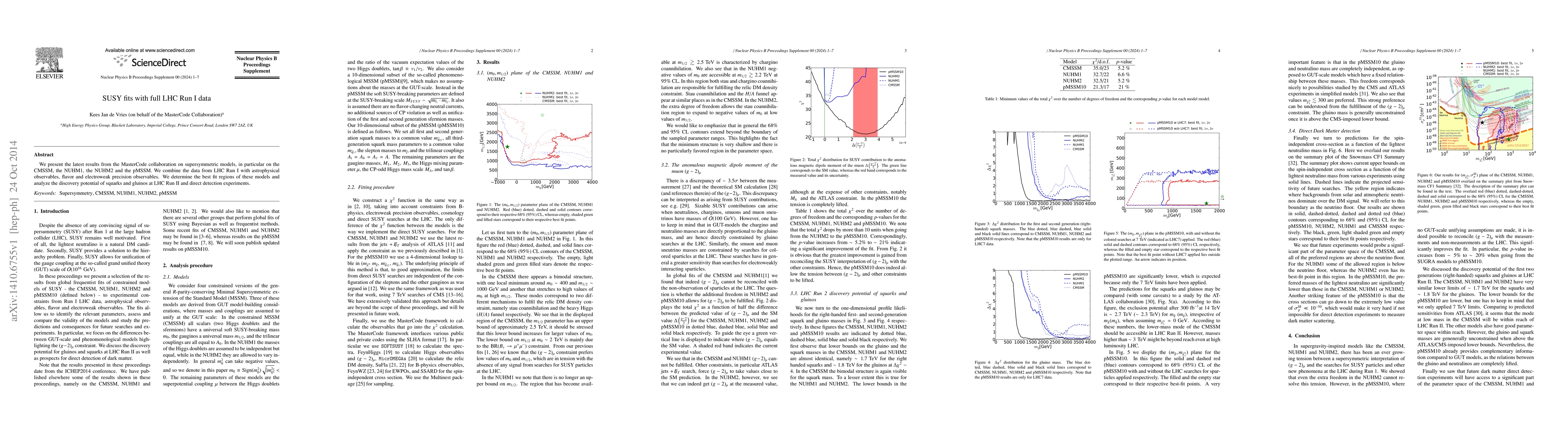 We present the latest results from the MasterCode Collaboration on supersymmetric models, in particular on the CMSSM, the NUHM1, the NUHM2 and the pMSSM. We combine the data from LHC Run I with astrophysical observables, flavor and electroweak precision observables. We determine the best fit regions of these models and analyze the discovery potential of squarks and gluinos at LHC Run II and direct detection experiments.