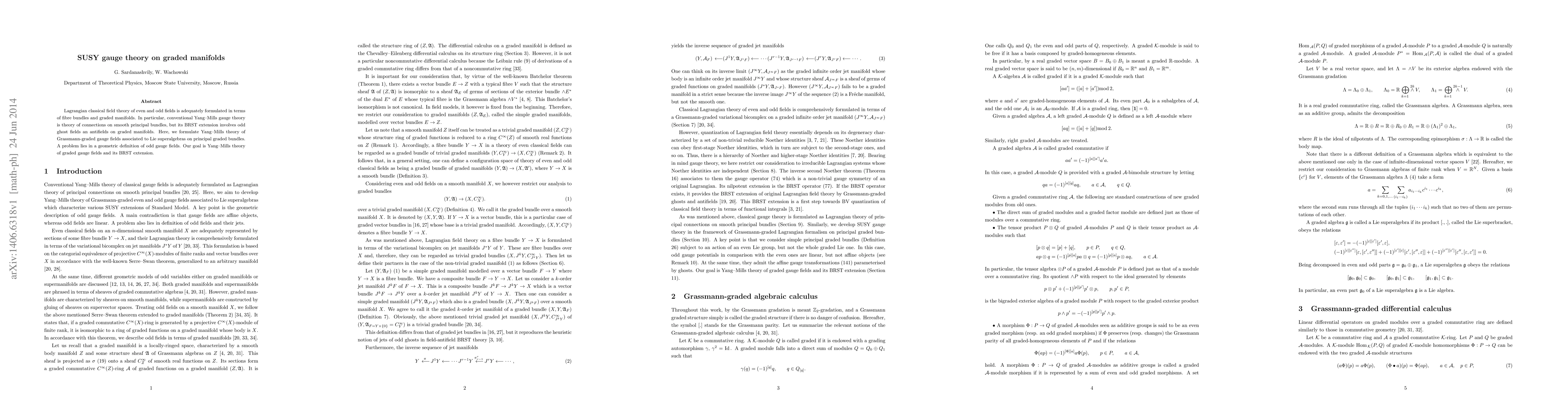 Lagrangian classical field theory of even and odd fields is adequately formulated in terms of fibre bundles and graded manifolds. In particular, conventional Yang-Mills gauge theory is theory of connections on smooth principal bundles, but its BRST extension involves odd ghost fields an antifields on graded manifolds. Here, we formulate Yang-Mills theory of Grassmann-graded gauge fields associated to Lie superalgebras on principal graded bundles. A problem lies in a geometric definition of odd gauge fields. Our goal is Yang--Mills theory of graded gauge fields and its BRST extension.