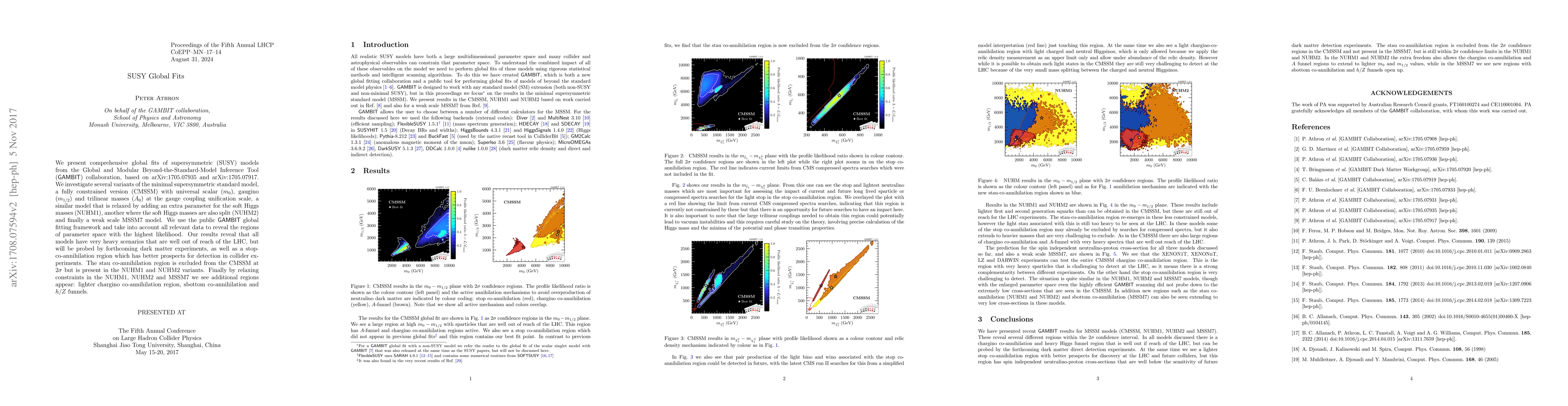 We present comprehensive global fits of supersymmetric (SUSY) models from the Global and Modular Beyond-the-Standard-Model Inference Tool (GAMBIT) collaboration, based on arXiv:1705.07935 and arXiv:1705.07917. We investigate several variants of the minimal supersymmetric standard model, a fully constrained version (CMSSM) with universal scalar ($m_0$), gaugino ($m_{1/2}$) and trilinear masses ($A_0$) at the gauge coupling unification scale, a similar model that is relaxed by adding an extra parameter for the soft Higgs masses (NUHM1), another where the soft Higgs masses are also split (NUHM2) and finally a weak scale MSSM7 model. We use the public GAMBIT global fitting framework and take into account all relevant data to reveal the regions of parameter space with the highest likelihood. Our results reveal that all models have very heavy scenarios that are well out of reach of the LHC, but will be probed by forthcoming dark matter experiments, as well as a stop-co-annihilation region which has better prospects for detection in collider experiments. The stau co-annihilation region is excluded from the CMSSM at $2 \sigma$ but is present in the NUHM1 and NUHM2 variants. Finally by relaxing constraints in the NUHM1, NUHM2 and MSSM7 we see additional regions appear: lighter chargino co-annihilation region, sbottom co-annihilation and $h/Z$ funnels.