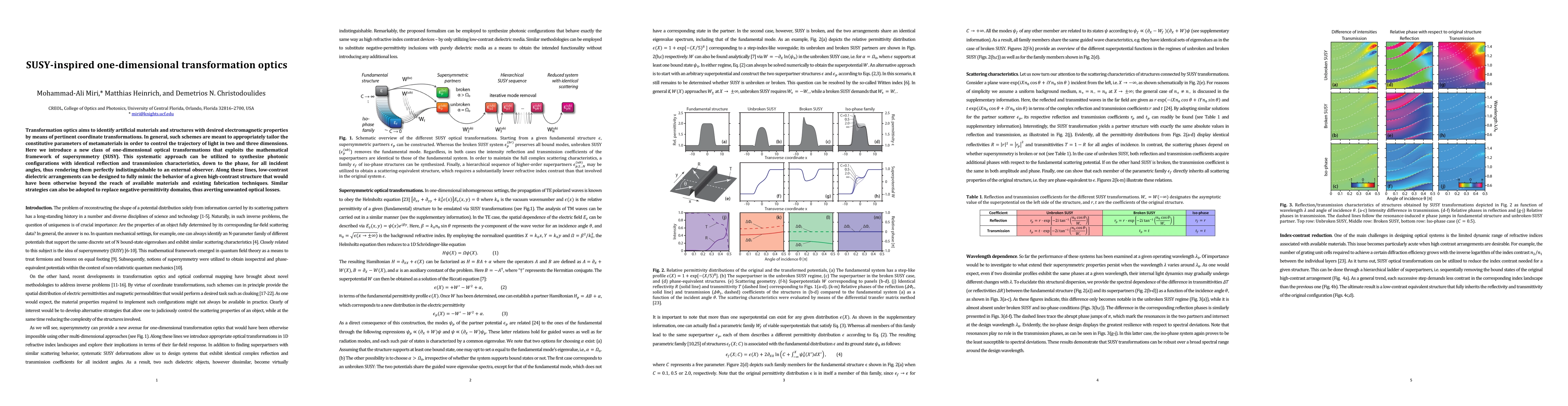 Transformation optics aims to identify artificial materials and structures with desired electromagnetic properties by means of pertinent coordinate transformations. In general, such schemes are meant to appropriately tailor the constitutive parameters of metamaterials in order to control the trajectory of light in two and three dimensions. Here we introduce a new class of one-dimensional optical transformations that exploits the mathematical framework of supersymmetry (SUSY). This systematic approach can be utilized to synthesize photonic configurations with identical reflection and transmission characteristics, down to the phase, for all incident angles, thus rendering them perfectly indistinguishable to an external observer. Along these lines, low-contrast dielectric arrangements can be designed to fully mimic the behavior of a given high-contrast structure that would have been otherwise beyond the reach of available materials and existing fabrication techniques. Similar strategies can also be adopted to replace negative-permittivity domains, thus averting unwanted optical losses.