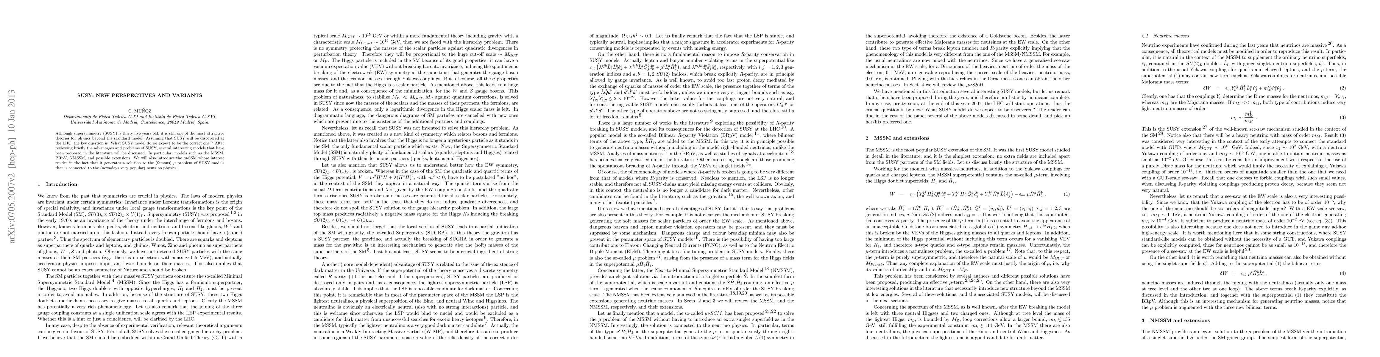 Although supersymmetry (SUSY) is thirty five years old, it is still one of the most attractive theories for physics beyond the standard model. Assuming that SUSY will be discovered at the LHC, the key question is: What SUSY model do we expect to be the correct one ? After reviewing briefly the advantages and problems of SUSY, several interesting models that have been proposed in the literature will be discussed. In particular, models such as the MSSM, BRpV, NMSSM, and possible extensions. We will also introduce the $\mu\nuSSM$ whose interest resides in the fact that it generates a solution to the (famous) $\mu$ problem of SUSY models that is connected to the (nowadays very popular) neutrino physics.