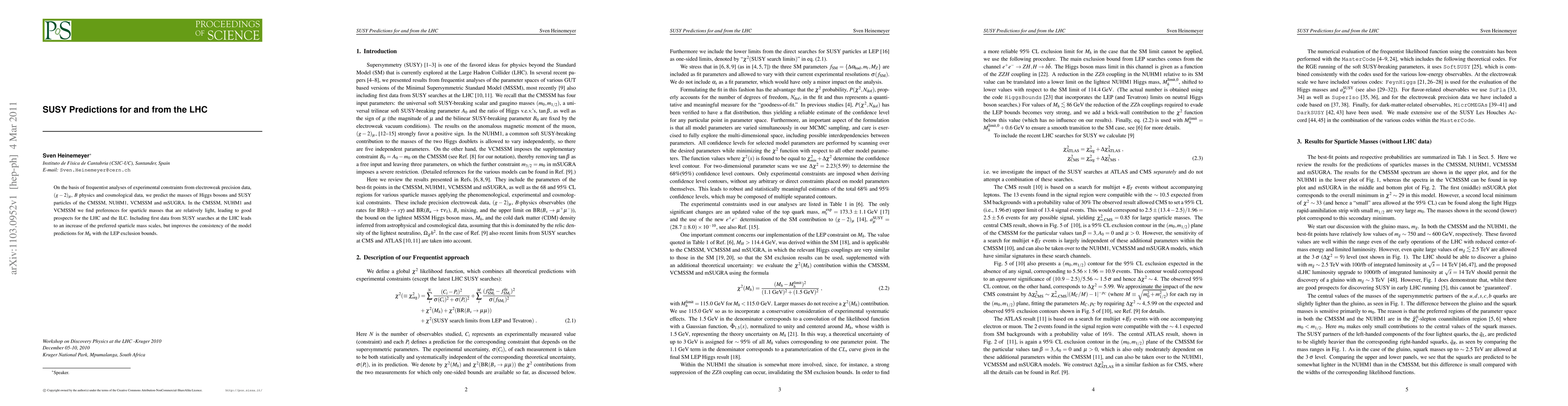 On the basis of frequentist analyses of experimental constraints from electroweak precision data, (g-2)_mu, B-physics and cosmological data, we predict the masses of Higgs bosons and SUSY particles of the CMSSM, NUHM1, VCMSSM and mSUGRA. In the CMSSM, NUHM1 and VCMSSM we find preferences for sparticle masses that are relatively light, leading to good prospects for the LHC and the ILC. Including first data from SUSY searches at the LHC leads to an increase of the preferred sparticle mass scales, but improves the consistency of the model predictions for M_h with the LEP exclusion bounds.
