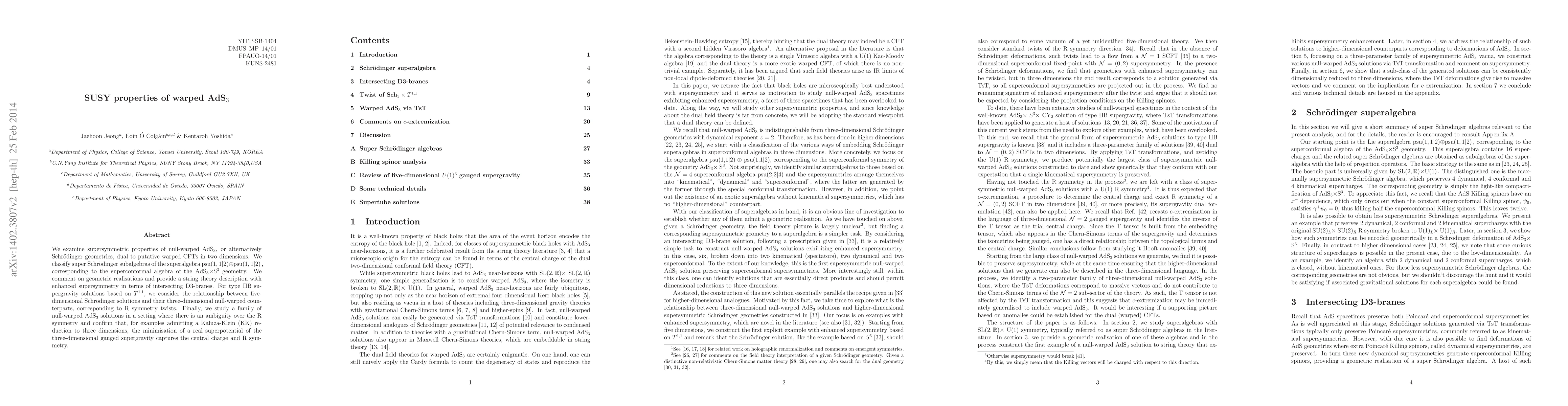 We examine supersymmetric properties of null-warped AdS$_3$, or alternatively Schrodinger geometries, dual to putative warped CFTs in two dimensions. We classify super Schrodinger subalgebras of the superalgebra psu(1, 1$|$2) $\oplus$ psu(1, 1$|$2), corresponding to the superconformal algebra of the AdS$_3 \times$ S$^3$ geometry. We comment on geometric realisations and provide a string theory description with enhanced supersymmetry in terms of intersecting D3-branes. For type IIB supergravity solutions based on T$^{1,1}$, we consider the relationship between five-dimensional Schrodinger solutions and their three-dimensional null-warped counterparts, corresponding to R symmetry twists. Finally, we study a family of null-warped AdS$_3$ solutions in a setting where there is an ambiguity over the R symmetry and confirm that, for examples admitting a Kaluza-Klein (KK) reduction to three dimensions, the minimisation of a real superpotential of the three-dimensional gauged supergravity captures the central charge and R symmetry.