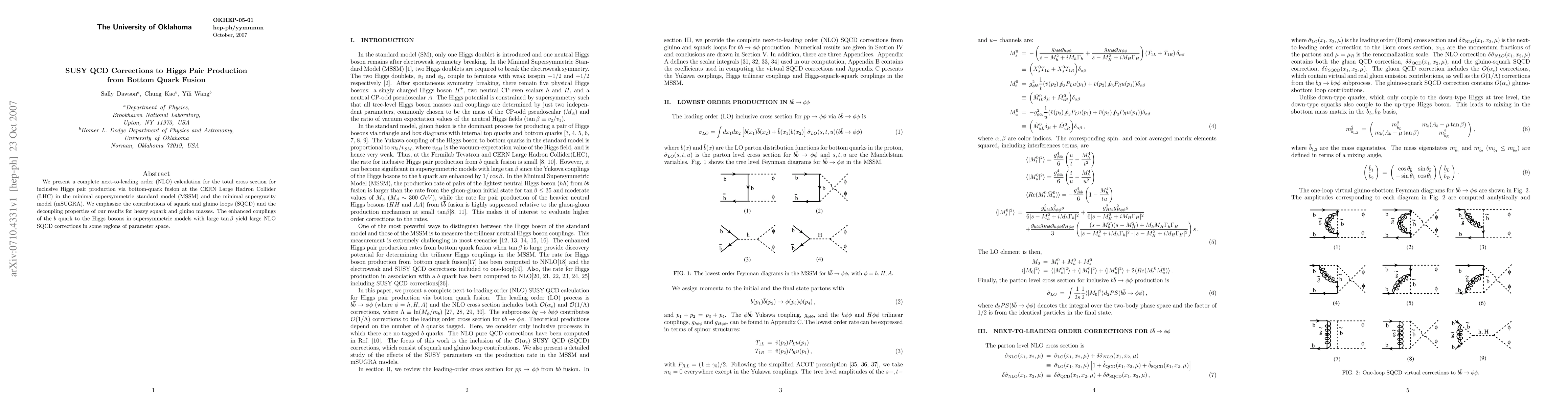This paper provides a complete next-to-leading order calculation for Higgs pair production via bottom-quark fusion at the LHC within the MSSM and mSUGRA, highlighting significant SUSY QCD corrections from squark and gluino loops, especially in regions with large tanβ.