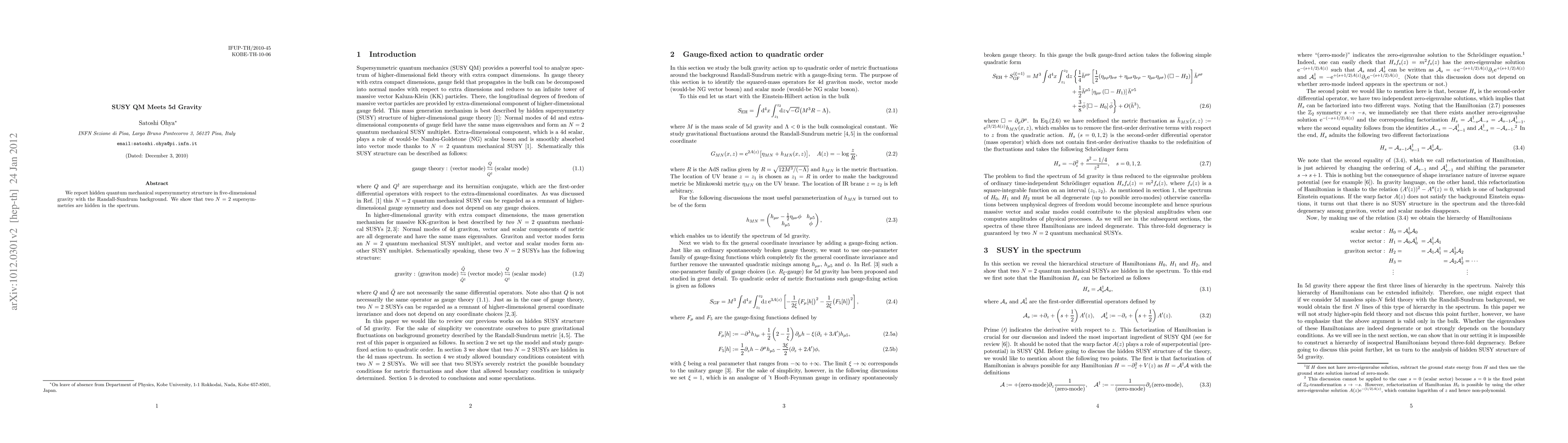 We report hidden quantum mechanical supersymmetry structure in five-dimensional gravity with the Randall-Sundrum background. We show that two N=2 supersymmetries are hidden in the spectrum.