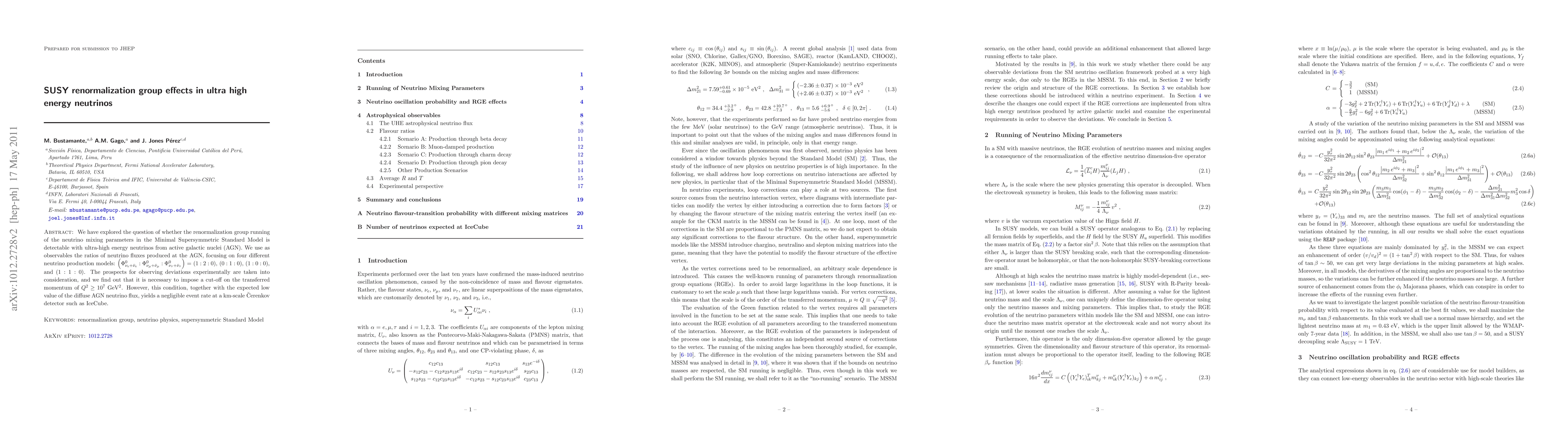 We have explored the question of whether the renormalization group running of the neutrino mixing parameters in the Minimal Supersymmetric Standard Model is detectable with ultra-high energy neutrinos from active galactic nuclei (AGN). We use as observables the ratios of neutrino fluxes produced at the AGN, focusing on four different neutrino production models: $(\Phi_{\nu_e+\bar{\nu}_e}^0 : \Phi_{\nu_\mu+\bar{\nu}_\mu}^0 : \Phi_{\nu_\tau+\bar{\nu}_\tau}^0)$ = (1:2:0), (0:1:0), (1:0:0), and (1:1:0). The prospects for observing deviations experimentally are taken into consideration, and we find out that it is necessary to impose a cut-off on the transferred momentum of $Q^2 \geq 10^7$ GeV$^2$. However, this condition, together with the expected low value of the diffuse AGN neutrino flux, yields a negligible event rate at a km-scale Cherenkov detector such as IceCube.
