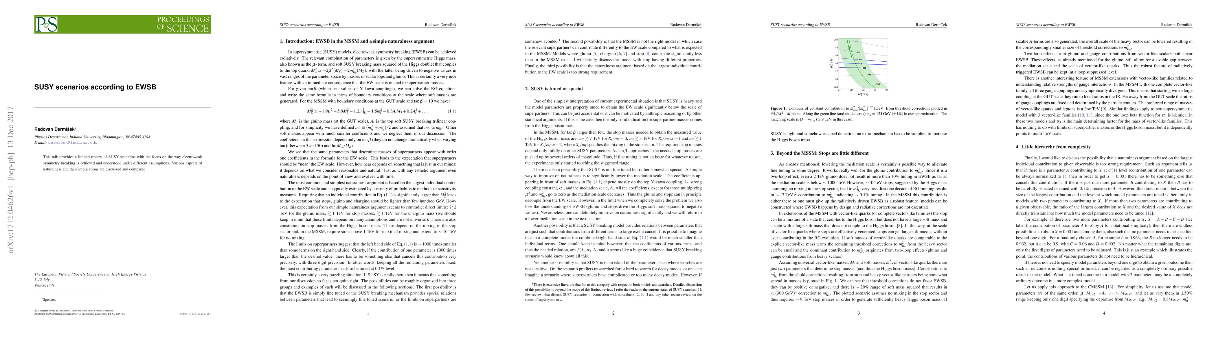 This talk provides a limited review of SUSY scenarios with the focus on the way electroweak symmetry breaking is achieved and understood under different assumptions. Various aspects of naturalness and their implications are discussed and compared.