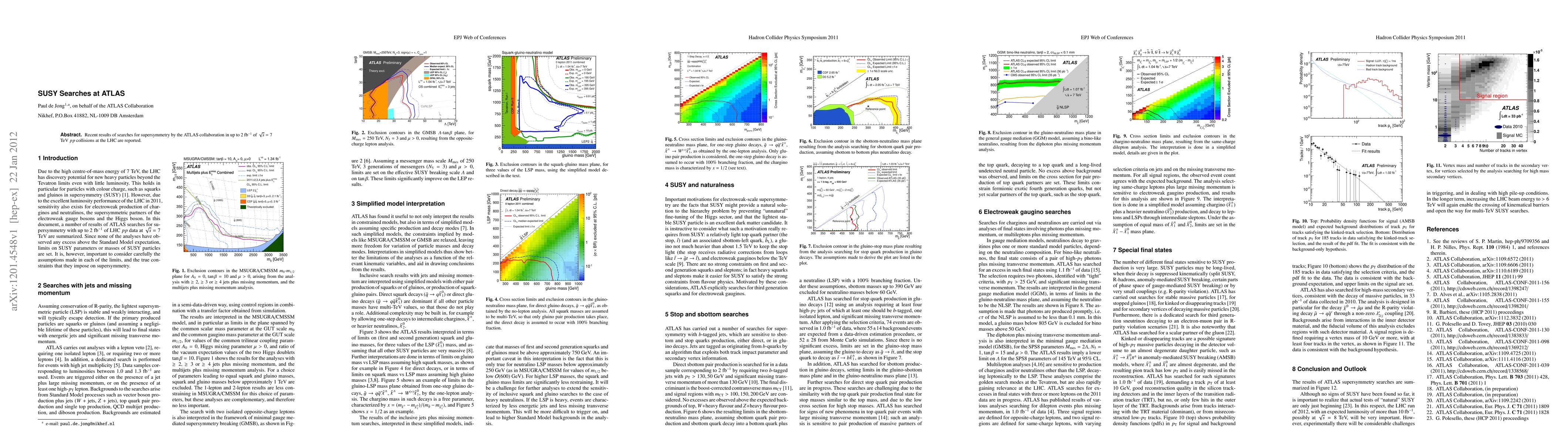 The ATLAS collaboration conducted searches for supersymmetry (SUSY) using up to 2 fb^-1 of sqrt(s) = 7 TeV pp collisions at the LHC, employing inclusive searches with jets and missing transverse momentum, as well as simplified model interpretations.