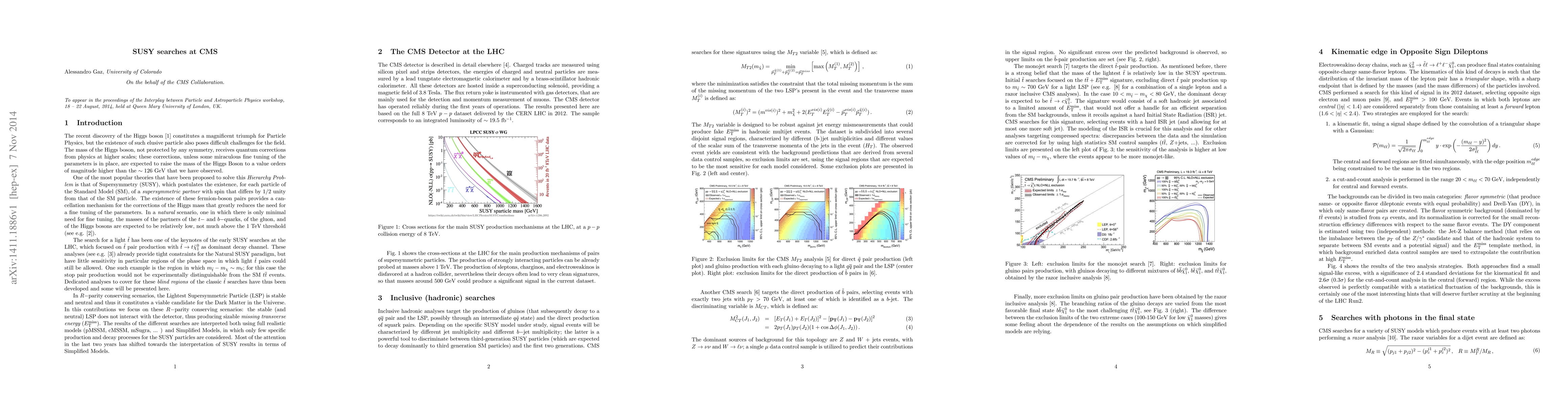 The CMS Collaboration performed an extensive program of searches for evidence of decay of supersymmetric particles using the full p−p Run 1 dataset collected at center-of-mass energies of 7 and 8 TeV.