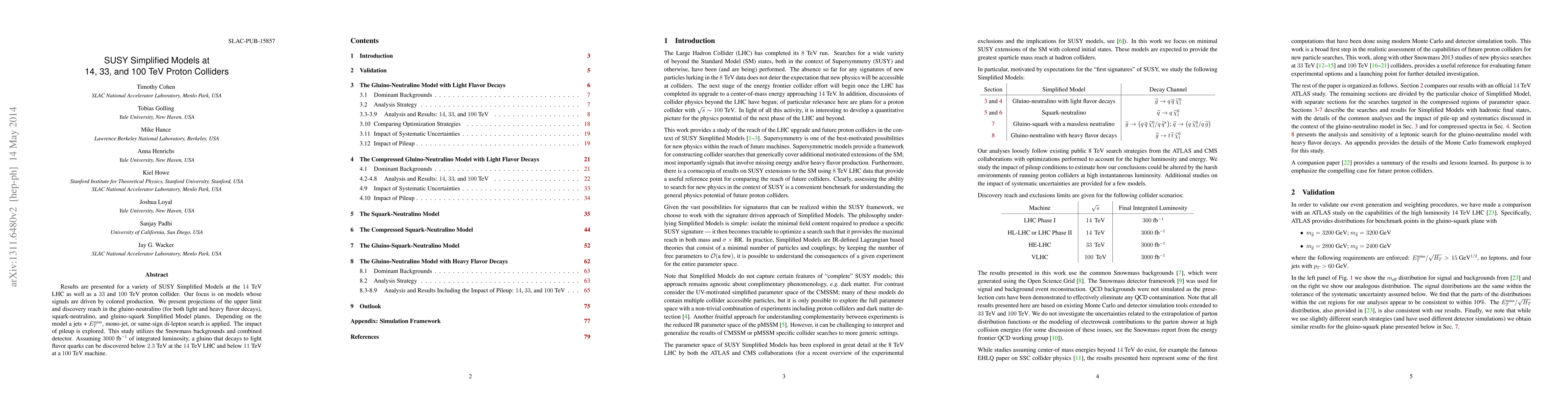 The paper presents detailed projections of discovery and exclusion reaches for various SUSY Simplified Models at different collider energies, incorporating multiple search channels and considering the effects of pileup.