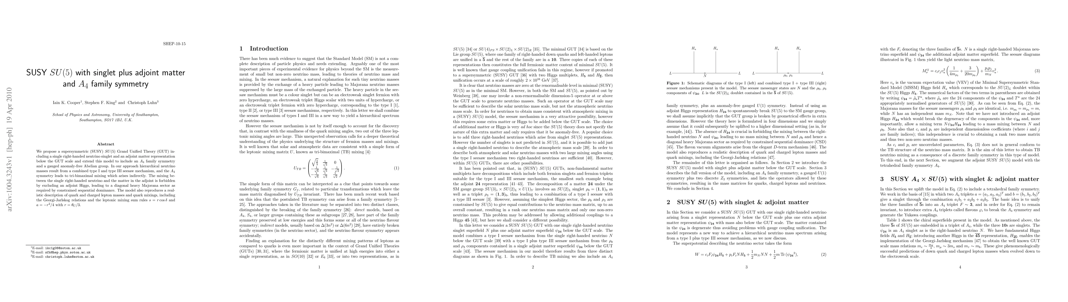 This paper proposes a SUSY SU(5) GUT with a singlet right-handed neutrino and an adjoint matter representation, incorporating an A4 family symmetry to achieve tri-bimaximal mixing. The model utilizes a combined type I and type III seesaw mechanism for hierarchical neutrino masses and reproduces realistic quark and lepton masses and mixings.