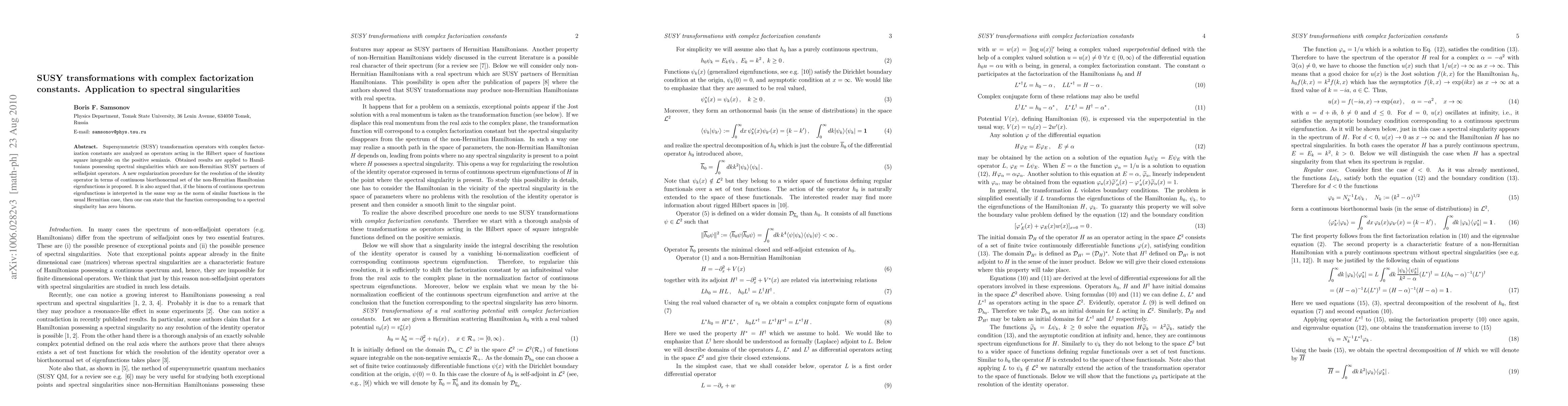 Research analyzes supersymmetric transformations with complex factorization constants to resolve spectral singularities in non-Hermitian Hamiltonians, proposing a regularization procedure based on continuous biorthonormal sets of eigenfunctions.