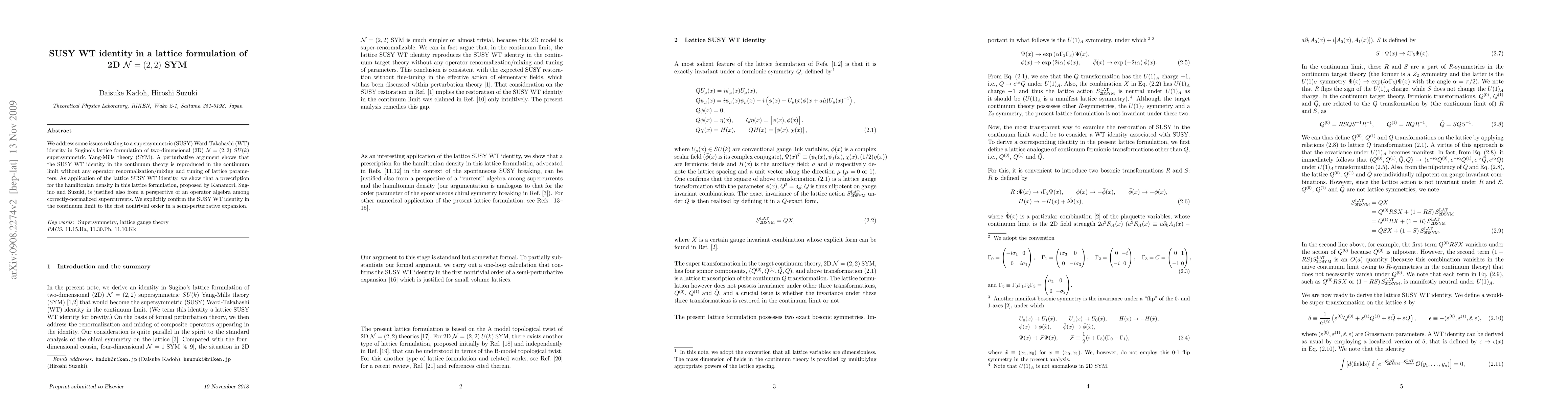 We address some issues relating to a supersymmetric (SUSY) Ward-Takahashi (WT) identity in Sugino's lattice formulation of two-dimensional (2D) $\mathcal{N}=(2,2)$ $SU(k)$ supersymmetric Yang-Mills theory (SYM). A perturbative argument shows that the SUSY WT identity in the continuum theory is reproduced in the continuum limit without any operator renormalization/mixing and tuning of lattice parameters. As application of the lattice SUSY WT identity, we show that a prescription for the hamiltonian density in this lattice formulation, proposed by Kanamori, Sugino and Suzuki, is justified also from a perspective of an operator algebra among correctly-normalized supercurrents. We explicitly confirm the SUSY WT identity in the continuum limit to the first nontrivial order in a semi-perturbative expansion.