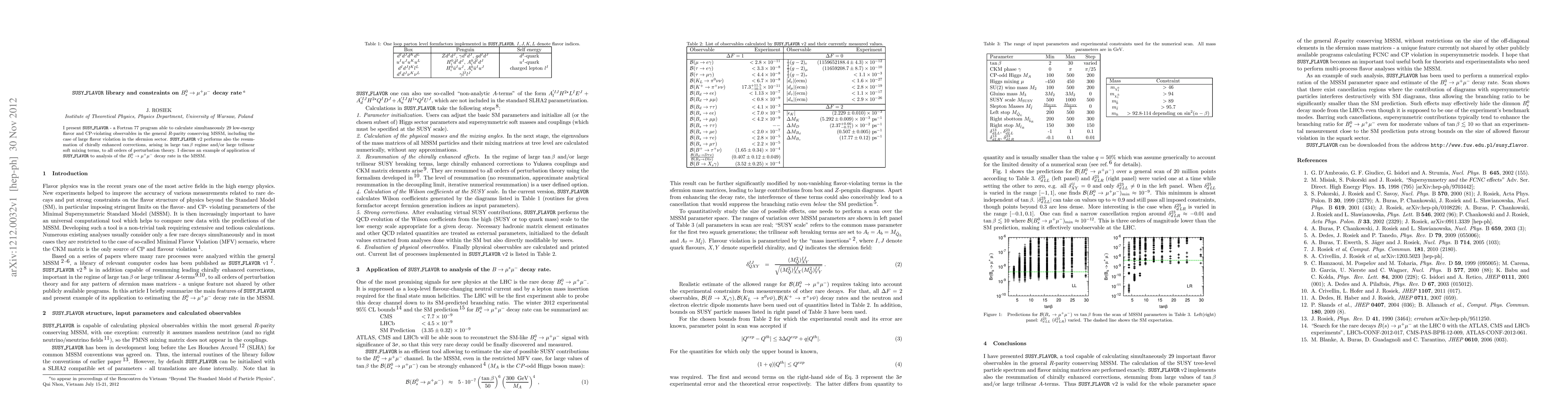 The SUSY_FLAVOR library is a Fortran 77 program that calculates 29 low-energy flavor and CP-violating observables in the general R-parity conserving MSSM, including resummation of chirally enhanced corrections. It applies to analyze the $B_s \to \mu^+ \mu^-$ decay rate within the MSSM framework.