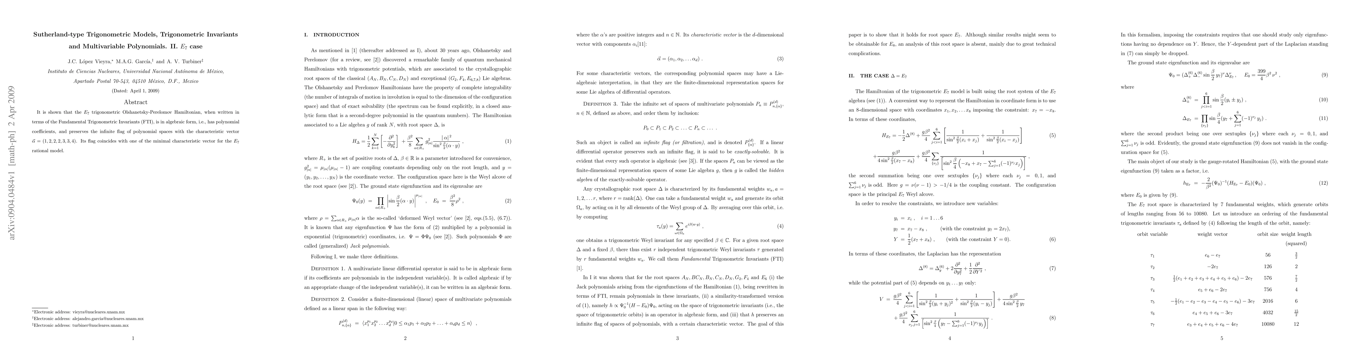 This paper demonstrates that the $E_7$ trigonometric Olshanetsky-Perelomov Hamiltonian, expressed using Fundamental Trigonometric Invariants, assumes an algebraic form with polynomial coefficients. It maintains an infinite flag of polynomial spaces characterized by the vector $\vec \alpha = (1,2,2,2,3,3,4)$, which matches a minimal characteristic vector for the $E_7$ rational model.