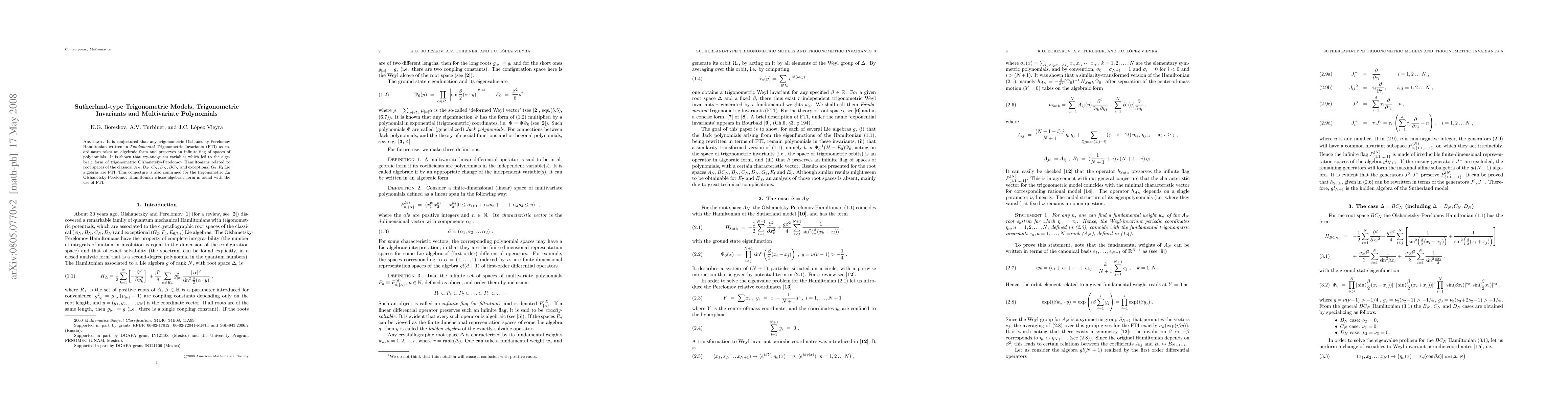 This paper confirms the conjecture that trigonometric Olshanetsky-Perelomov Hamiltonians, when expressed in Fundamental Trigonometric Invariants (FTI), maintain an algebraic form and uphold an infinite sequence of polynomial spaces. FTI is shown to relate to Hamiltonians linked with classical and exceptional Lie algebras.