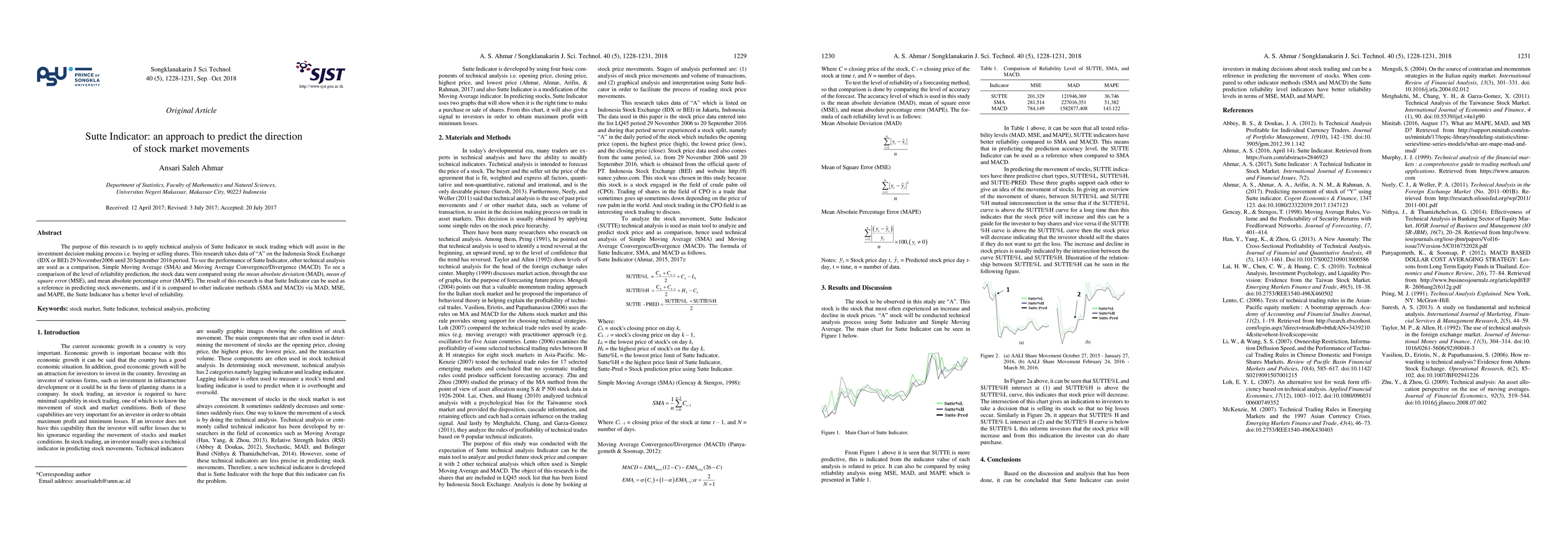 The purpose of this research is to apply technical analysis of Sutte Indicator in stock trading which will assist in the investment decision making process i.e. buying or selling shares. This research takes data of "A" on the Indonesia Stock Exchange(IDX or BEI) 29 November 2006 until 20 September 2016 period. To see the performance of Sutte Indicator, other technical analysis are used as a comparison, Simple Moving Average (SMA) and Moving Average Convergence/Divergence (MACD). To see a comparison of the level of reliability prediction, the stock data were compared using the mean absolute deviation (MAD), mean of square error (MSE), and mean absolute percentage error (MAPE). The result of this research is that Sutte Indicator can be used as a reference in predicting stock movements, and if it is compared to other indicator methods (SMA and MACD) via MAD, MSE, and MAPE, the Sutte Indicator has a better level of reliability.