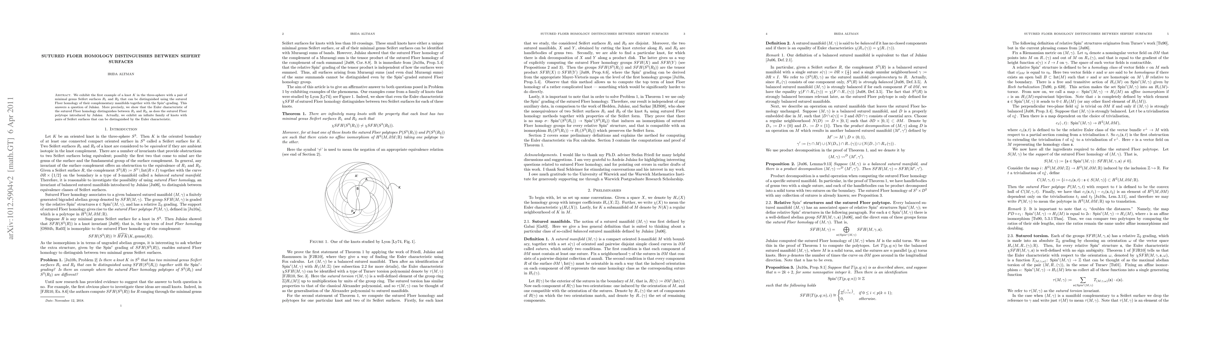 We exhibit the first example of a knot in the three-sphere with a pair of minimal genus Seifert surfaces that can be distinguished using the sutured Floer homology of their complementary manifolds together with the Spin^c-grading. This answers a question of Juh\'asz. More precisely, we show that the Euler characteristic of the sutured Floer homology of the complementary manifolds distinguishes between the two surfaces, as does the sutured Floer polytope introduced by Juh\'asz. Actually, we exhibit an infinite family of knots with pairs of Seifert surfaces that can be distinguished by the Euler characteristic.