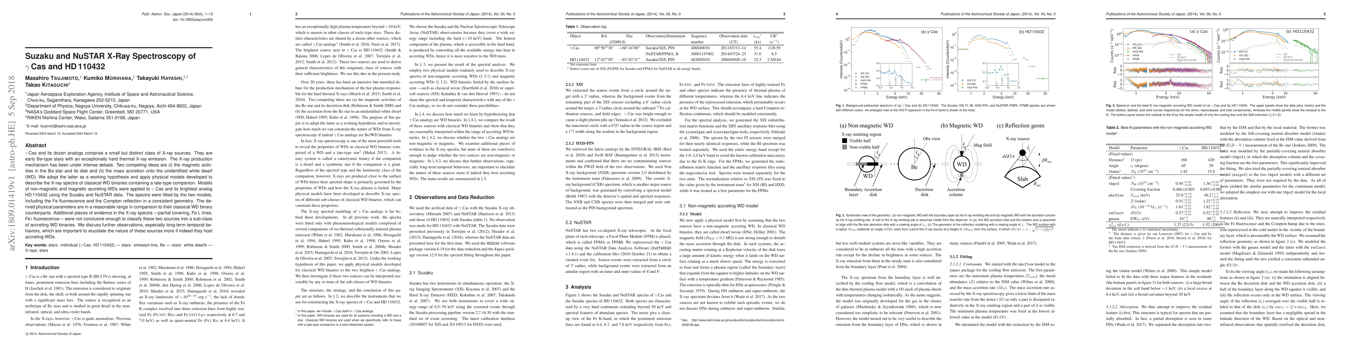 Gamma Cas and its dozen analogs comprise a small but distinct class of X-ray sources. They are early Be-type stars with an exceptionally hard thermal X-ray emission. The X-ray production mechanism has been under intense debate. Two competing ideas are (i) the magnetic activities in the Be star and its disk and (ii) the mass accretion onto the unidentified white dwarf (WD). We adopt the latter as a working hypothesis and apply physical models developed to describe the X-ray spectra of classical WD binaries containing a late-type companion. Models of non-magnetic and magnetic accreting WDs were applied to gamma Cas and its brightest analog HD110432 using the Suzaku and NuSTAR data. The spectra were fitted by the two models, including the Fe I fluorescence and the Compton reflection in a consistent geometry. The derived physical parameters, such as the WD mass and mass accretion rate, are in a reasonable range in comparison to their classical WD binary counterparts. Additional pieces of evidence in the X-ray spectra (partial covering, Fe L lines, and Fe I fluorescence) were not conclusive enough to classify these two sources into a sub-class of accreting WD binaries. We discuss further observations, especially long-term temporal behaviors, which are important to elucidate the nature of these sources more if indeed they host accreting WDs.